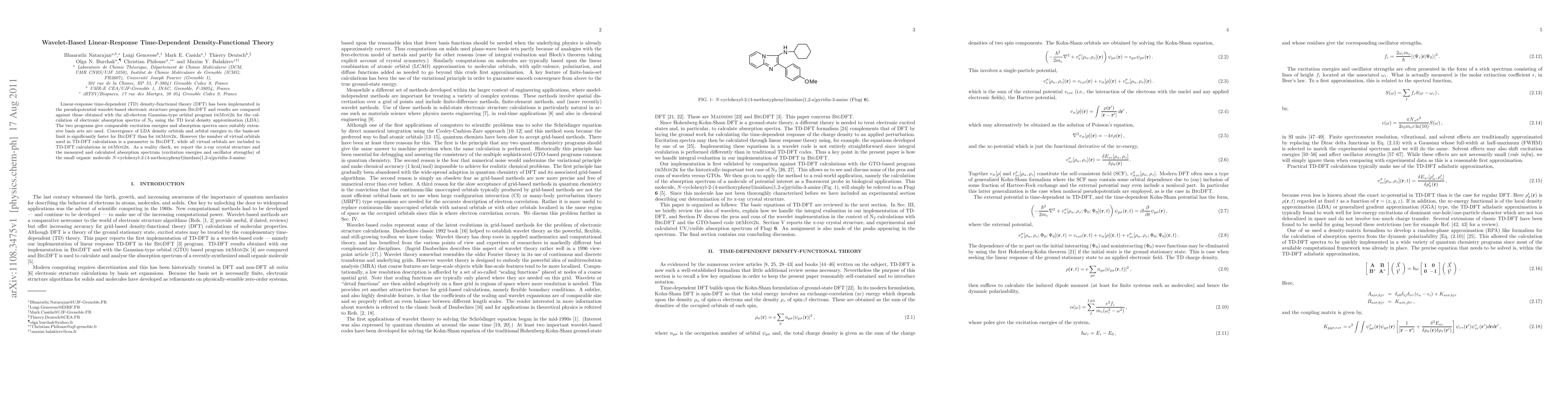 Linear-response time-dependent (TD) density-functional theory (DFT) has been implemented in the pseudopotential wavelet-based electronic structure program BigDFT and results are compared against those obtained with the all-electron Gaussian-type orbital program deMon2k for the calculation of electronic absorption spectra of N2 using the TD local density approximation (LDA). The two programs give comparable excitation energies and absorption spectra once suitably extensive basis sets are used. Convergence of LDA density orbitals and orbital energies to the basis-set limit is significantly faster for BigDFT than for deMon2k. However the number of virtual orbitals used in TD-DFT calculations is a parameter in BigDFT, while all virtual orbitals are included in TD-DFT calculations in deMon2k. As a reality check, we report the x-ray crystal structure and the measured and calculated absorption spectrum (excitation energies and oscillator strengths) of the small organic molecule N-cyclohexyl-2-(4-methoxyphenyl)imidazo[1,2-a]pyridin-3-amine.