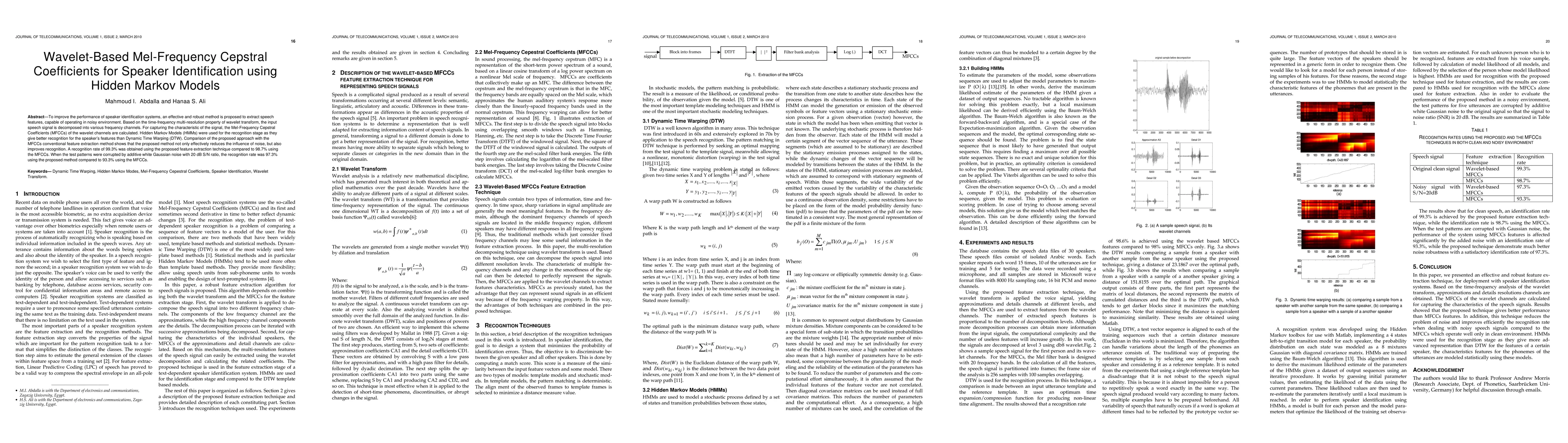 This paper proposes a wavelet-based method for extracting Mel-Frequency Cepstral Coefficients (MFCCs) for speaker identification, utilizing Hidden Markov Models (HMMs) for recognition. The method shows improved performance in noisy environments, achieving a 99.3% recognition rate compared to 98.7% using conventional MFCCs.