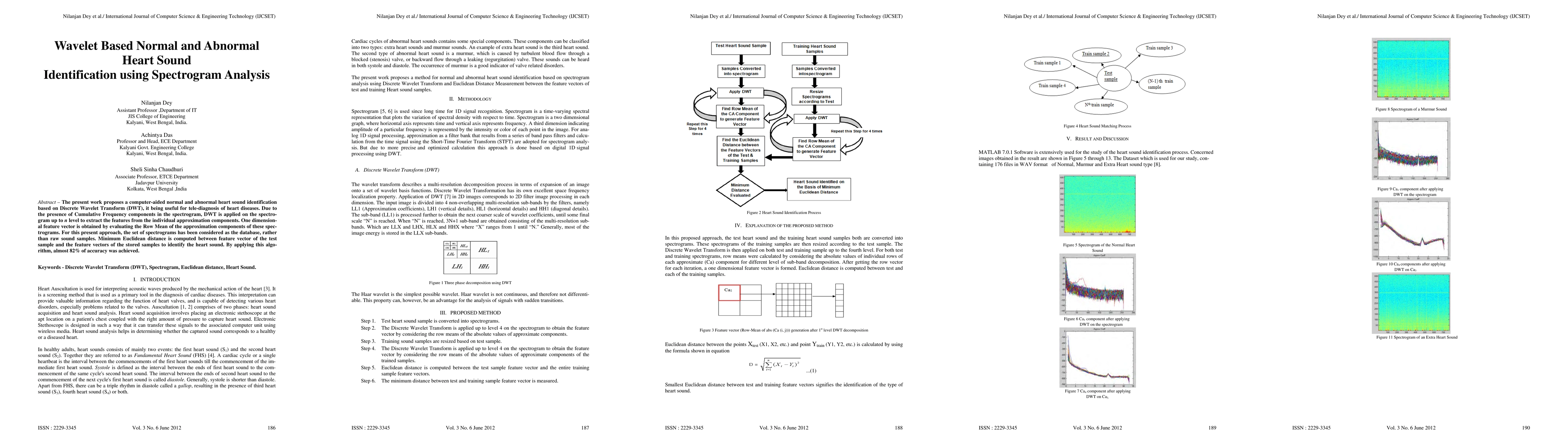 This paper proposes a method for identifying normal and abnormal heart sounds using Discrete Wavelet Transform (DWT) on spectrograms, achieving 82% accuracy. Features are extracted from spectrogram approximation components and compared to a database of spectrograms for tele-diagnosis.