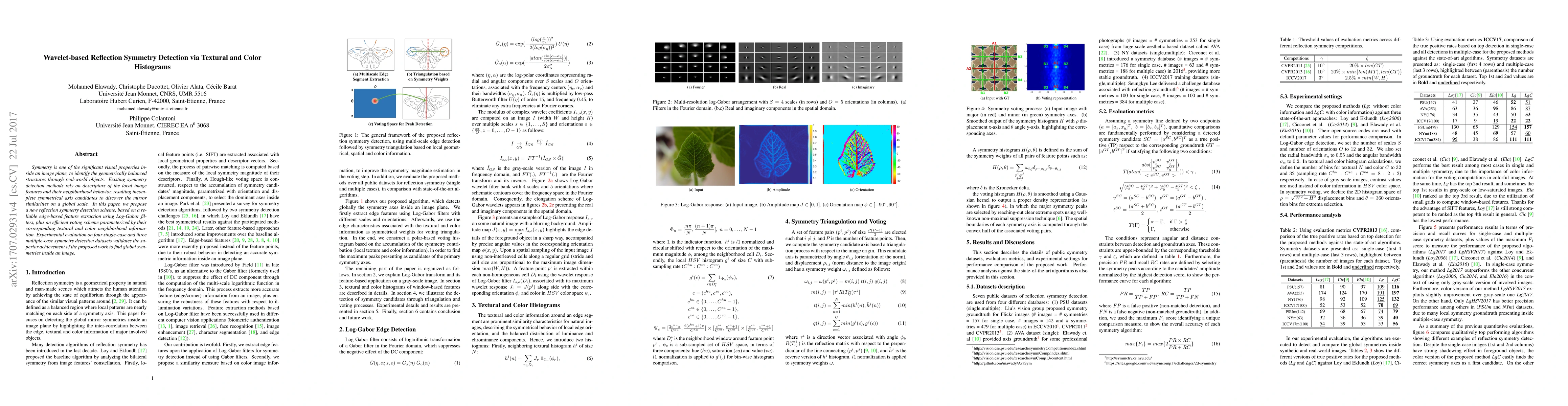 Symmetry is one of the significant visual properties inside an image plane, to identify the geometrically balanced structures through real-world objects. Existing symmetry detection methods rely on descriptors of the local image features and their neighborhood behavior, resulting incomplete symmetrical axis candidates to discover the mirror similarities on a global scale. In this paper, we propose a new reflection symmetry detection scheme, based on a reliable edge-based feature extraction using Log-Gabor filters, plus an efficient voting scheme parameterized by their corresponding textural and color neighborhood information. Experimental evaluation on four single-case and three multiple-case symmetry detection datasets validates the superior achievement of the proposed work to find global symmetries inside an image.