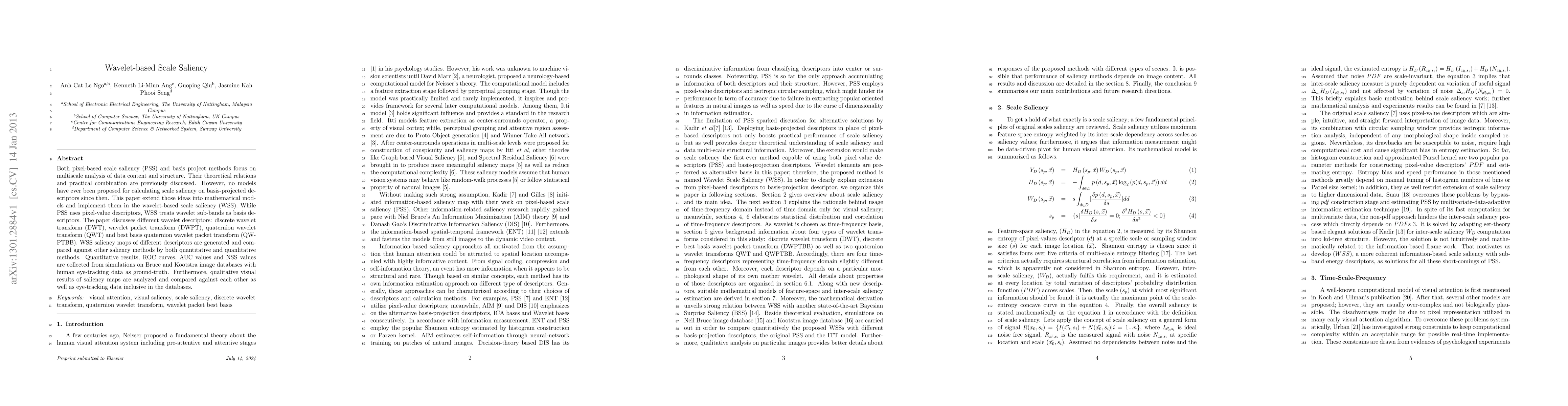 This paper introduces wavelet-based scale saliency (WSS) to calculate scale saliency using wavelet sub-bands as basis descriptors, contrasting with pixel-based scale saliency (PSS). It evaluates various wavelet transforms and compares WSS saliency maps quantitatively and qualitatively against other methods using human eye-tracking data from image databases.