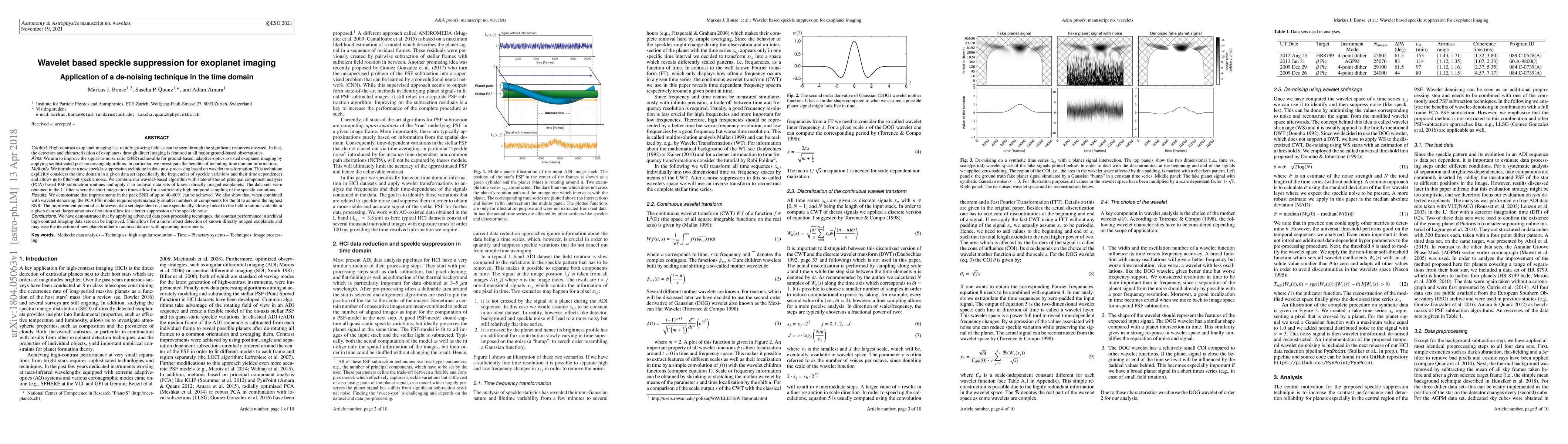 This paper introduces a wavelet-based speckle suppression technique for enhancing the signal-to-noise ratio in exoplanet imaging, showing up to a 60% improvement in peak SNR. The method leverages time domain information to filter out speckle noise, and when combined with PCA PSF subtraction, requires fewer components for optimal results.