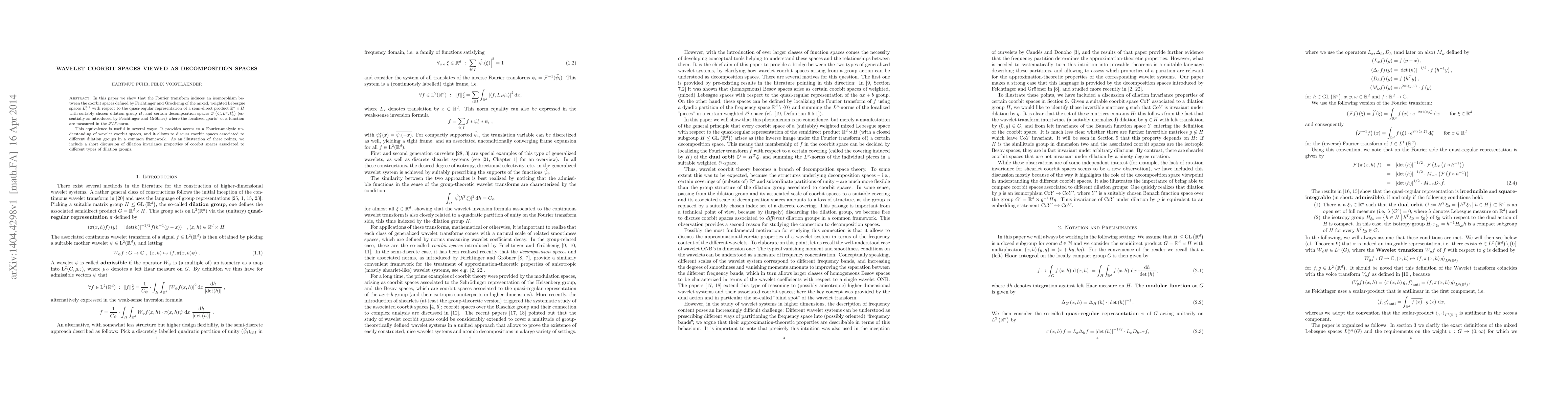 This paper demonstrates that the Fourier transform establishes an isomorphism between coorbit spaces and decomposition spaces, facilitating a Fourier-analytic understanding of wavelet coorbit spaces and enabling a unified discussion of coorbit spaces linked to various dilation groups.