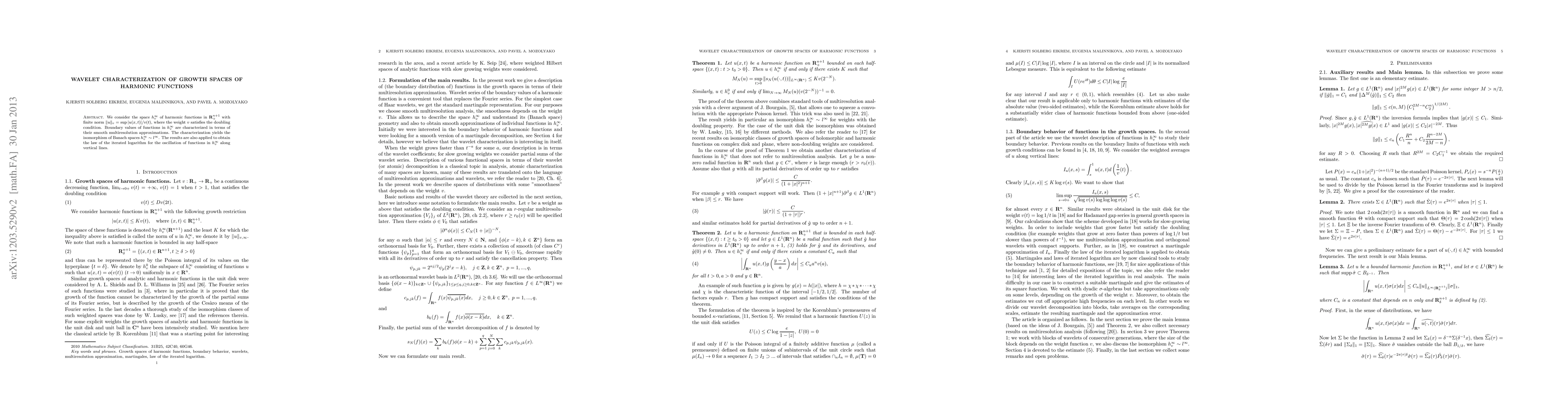 This paper explores the wavelet decomposition of harmonic functions in growth spaces, utilizing multiresolution approximations to describe the functions' behavior near the boundary. It applies these results to prove the law of the iterated logarithm for harmonic function oscillations along vertical lines.