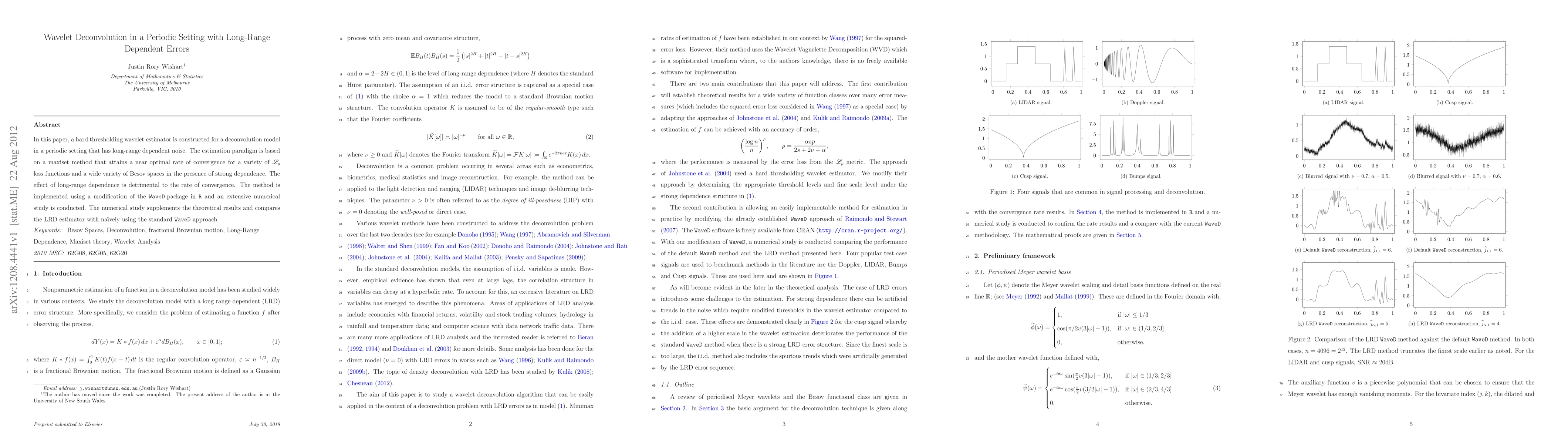 This paper constructs a hard thresholding wavelet estimator for a deconvolution model in periodic settings with long-range dependent noise, achieving near-optimal convergence rates. The method is implemented in R and supported by a numerical study comparing it to the standard approach.