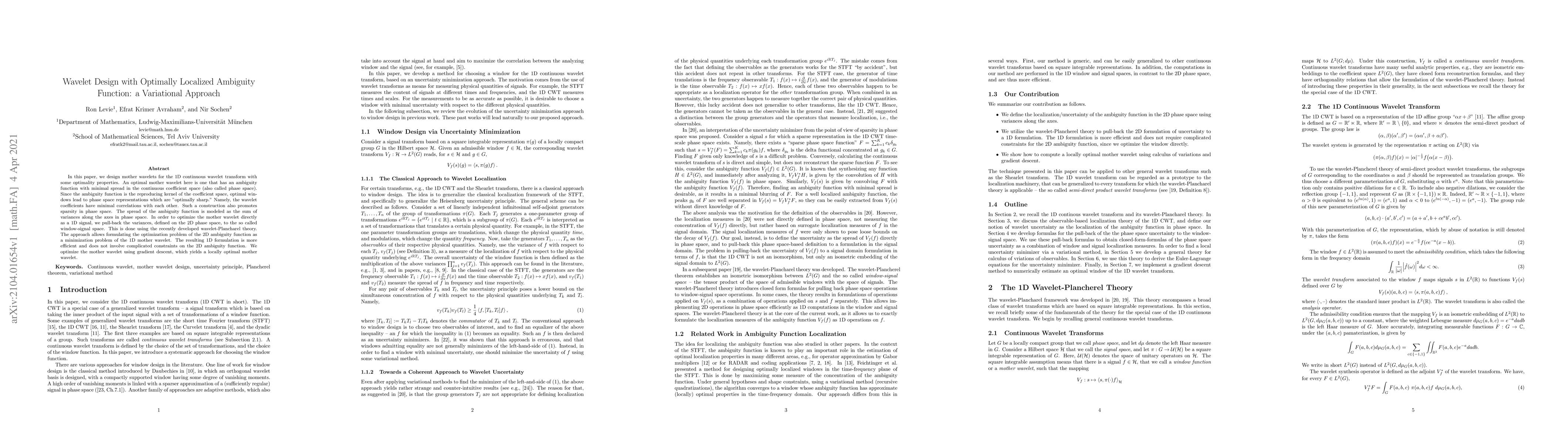The paper presents a variational approach to design mother wavelets for the 1D continuous wavelet transform, optimizing the ambiguity function's spread in the coefficient space.