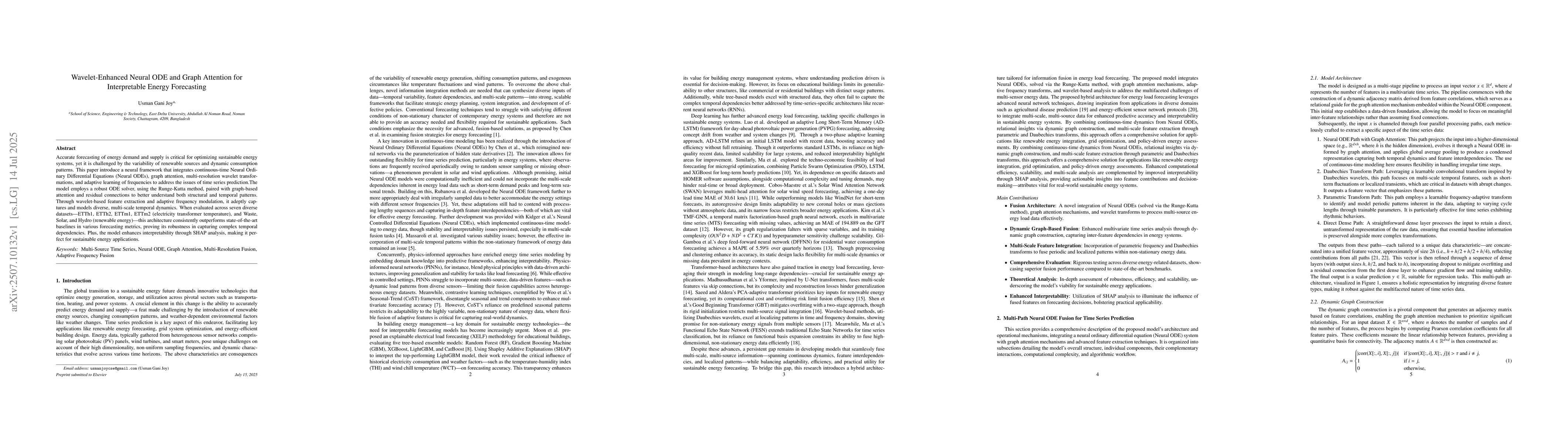 Accurate forecasting of energy demand and supply is critical for optimizing sustainable energy systems, yet it is challenged by the variability of renewable sources and dynamic consumption patterns. This paper introduces a neural framework that integrates continuous-time Neural Ordinary Differential Equations (Neural ODEs), graph attention, multi-resolution wavelet transformations, and adaptive learning of frequencies to address the issues of time series prediction. The model employs a robust ODE solver, using the Runge-Kutta method, paired with graph-based attention and residual connections to better understand both structural and temporal patterns. Through wavelet-based feature extraction and adaptive frequency modulation, it adeptly captures and models diverse, multi-scale temporal dynamics. When evaluated across seven diverse datasets: ETTh1, ETTh2, ETTm1, ETTm2 (electricity transformer temperature), and Waste, Solar, and Hydro (renewable energy), this architecture consistently outperforms state-of-the-art baselines in various forecasting metrics, proving its robustness in capturing complex temporal dependencies. Furthermore, the model enhances interpretability through SHAP analysis, making it suitable for sustainable energy applications.