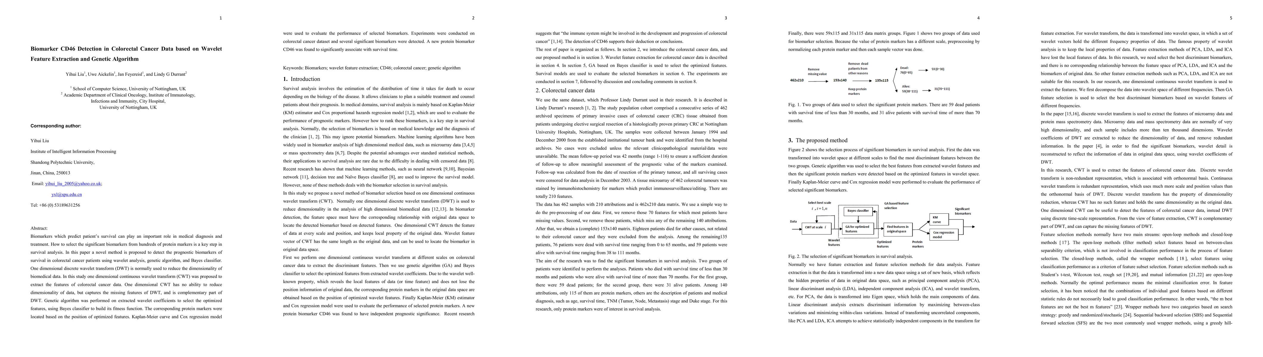 This research proposes a novel method for detecting significant biomarkers predicting colorectal cancer patient survival. It combines one-dimensional continuous wavelet transform (CWT) for feature extraction, a genetic algorithm for feature selection, and a Bayes classifier. The study successfully identified several significant biomarkers, including a new one, CD46, associated with survival time.