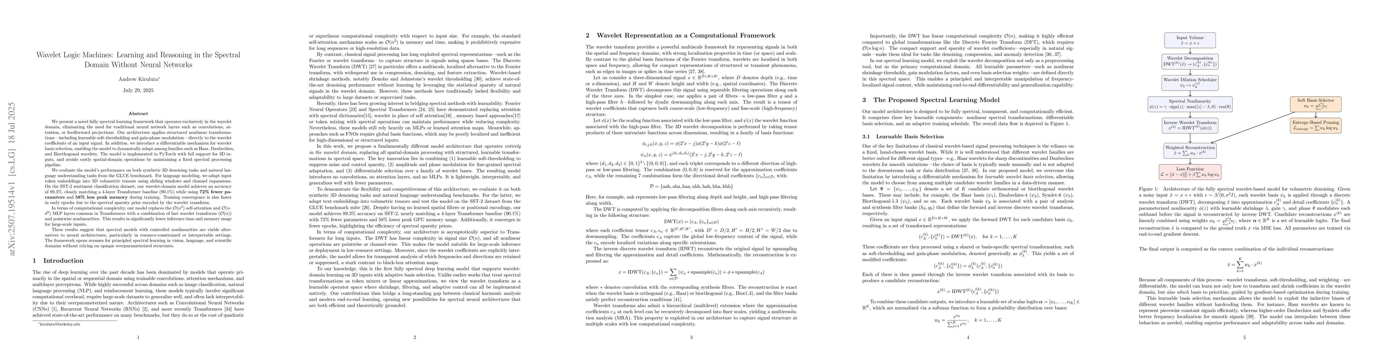 We introduce a fully spectral learning framework that eliminates traditional neural layers by operating entirely in the wavelet domain. The model applies learnable nonlinear transformations, including soft-thresholding and gain-phase modulation, directly to wavelet coefficients. It also includes a differentiable wavelet basis selection mechanism, enabling adaptive processing using families such as Haar, Daubechies, and Biorthogonal wavelets. Implemented in PyTorch with full 3D support, the model maintains a spectral pipeline without spatial convolutions or attention. On synthetic 3D denoising and natural language tasks from the GLUE benchmark, including SST-2 sentiment classification, the model achieves 89.3 percent accuracy, close to a 4-layer Transformer baseline (90.1 percent), while using 72 percent fewer parameters and 58 percent less peak memory. Faster early convergence is observed due to spectral sparsity priors. In contrast to the quadratic complexity of self-attention and large matrix multiplications in Transformers, our approach uses linear-time wavelet transforms and pointwise nonlinearities, significantly reducing inference cost. This yields a compact, interpretable, and efficient alternative to neural models. Our results support the viability of principled spectral learning in both vision and language tasks, offering new directions for model design without overparameterized architectures.