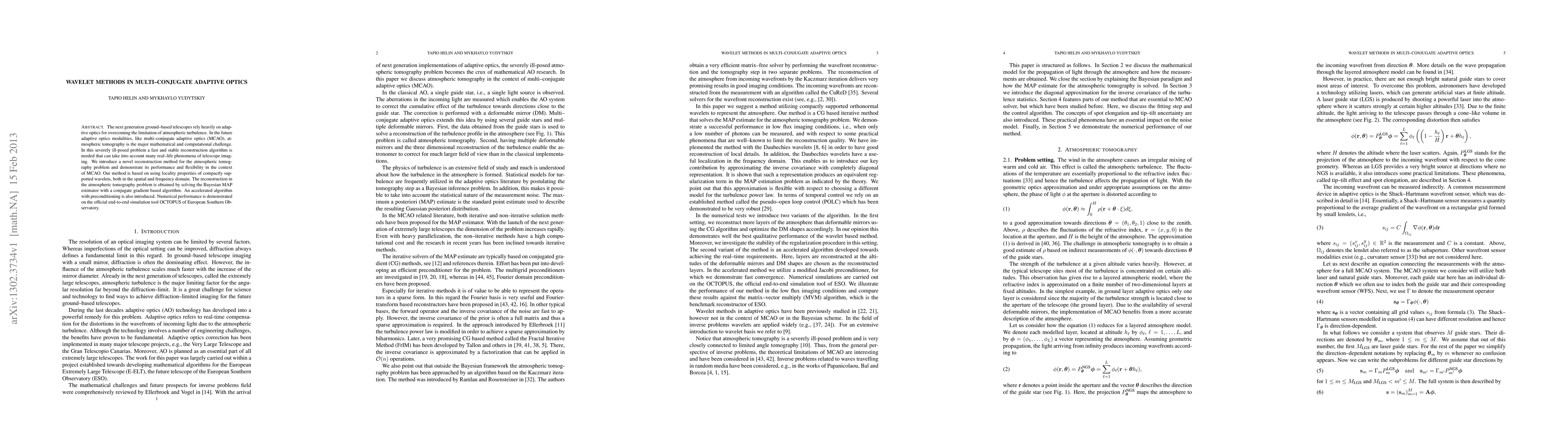 The next generation ground-based telescopes rely heavily on adaptive optics for overcoming the limitation of atmospheric turbulence. In the future adaptive optics modalities, like multi-conjugate adaptive optics (MCAO), atmospheric tomography is the major mathematical and computational challenge. In this severely ill-posed problem a fast and stable reconstruction algorithm is needed that can take into account many real-life phenomena of telescope imaging. We introduce a novel reconstruction method for the atmospheric tomography problem and demonstrate its performance and flexibility in the context of MCAO. Our method is based on using locality properties of compactly supported wavelets, both in the spatial and frequency domain. The reconstruction in the atmospheric tomography problem is obtained by solving the Bayesian MAP estimator with a conjugate gradient based algorithm. An accelerated algorithm with preconditioning is also introduced. Numerical performance is demonstrated on the official end-to-end simulation tool OCTOPUS of European Southern Observatory.