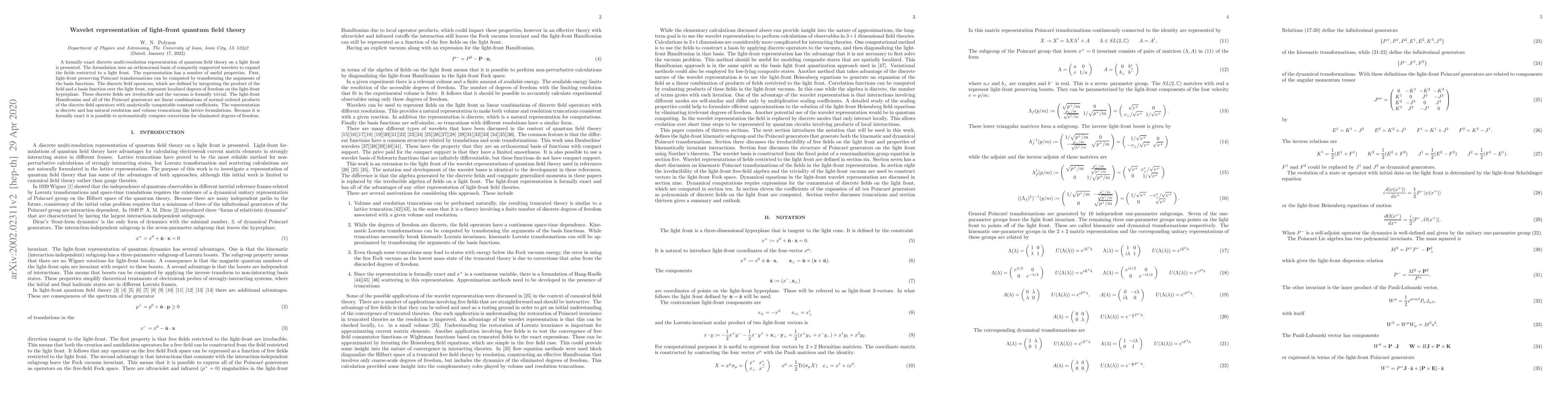 A formally exact discrete multi-resolution representation of quantum field theory on a light front is presented. The formulation uses an orthonormal basis of compactly supported wavelets to expand the fields restricted to a light front. The representation has a number of useful properties. First, light front preserving Poincar\'e transformations can be computed by transforming the arguments of the basis functions. The discrete field operators, which are defined by integrating the product of the field and the basis functions over the light front, represent localized degrees of freedom on the light-front hyperplane. These discrete fields are irreducible and the vacuum is formally trivial. The light-front Hamiltonian and all of the Poincar\'e generators are linear combinations of normal ordered products of the discrete field operators with analytically computable constant coefficients. The representation is discrete and has natural resolution and volume truncations like lattice formulations. Because it is formally exact it is possible to systematically compute corrections for eliminated degrees of freedom.