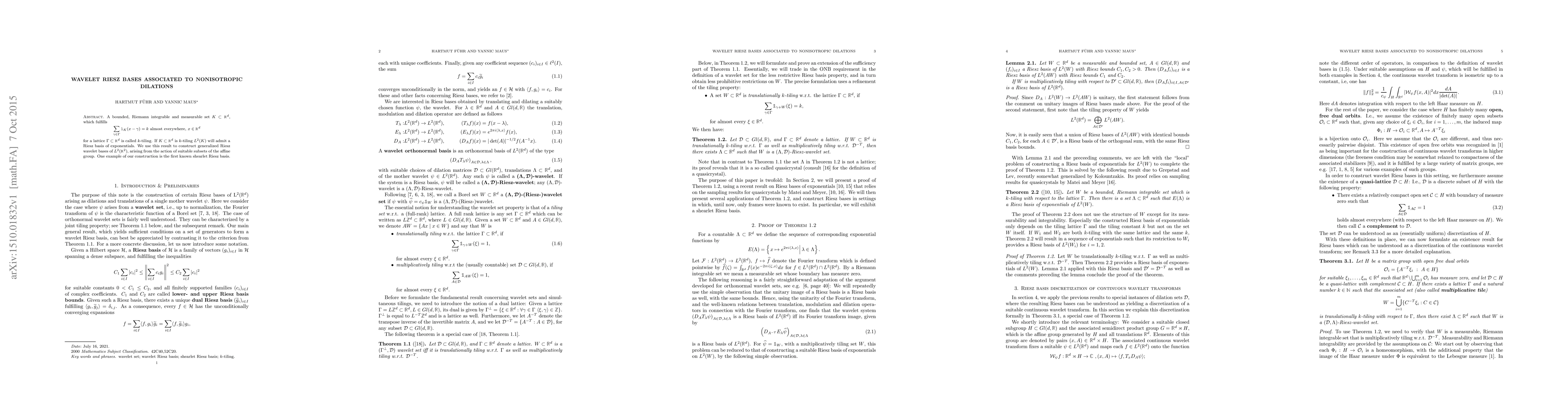 A bounded, Riemann integrable and measurable set $K\subset \mathbb{R}^d$, which fulfills \[\sum\limits_{\gamma\in\Gamma}\mathbb{1}_K(x-\gamma)=k\text{ almost everywhere, $x\in\mathbb{R}^d$}\] for a lattice $\Gamma\subset\mathbb{R}^d$ is called $k$-tiling. If $K\subset\mathbb{R}^d$ is $k$-tiling $L^2(K)$ will admit a Riesz basis of exponentials. We use this result to construct generalized Riesz wavelet bases of $L^2(\mathbb{R}^2)$, arising from the action of suitable subsets of the affine group. One example of our construction is the first known shearlet Riesz basis.