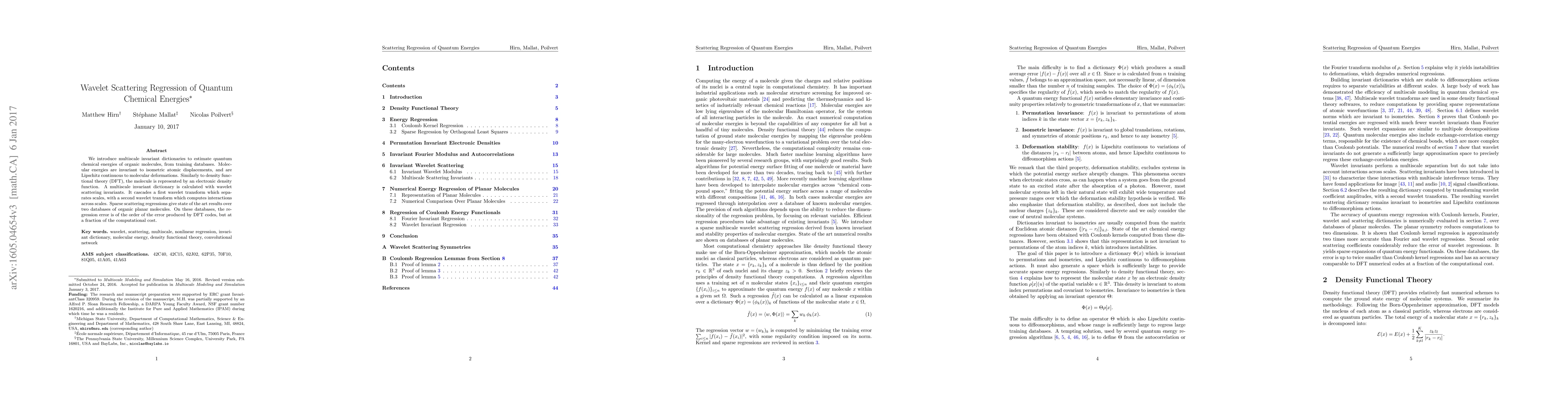 We introduce multiscale invariant dictionaries to estimate quantum chemical energies of organic molecules, from training databases. Molecular energies are invariant to isometric atomic displacements, and are Lipschitz continuous to molecular deformations. Similarly to density functional theory (DFT), the molecule is represented by an electronic density function. A multiscale invariant dictionary is calculated with wavelet scattering invariants. It cascades a first wavelet transform which separates scales, with a second wavelet transform which computes interactions across scales. Sparse scattering regressions give state of the art results over two databases of organic planar molecules. On these databases, the regression error is of the order of the error produced by DFT codes, but at a fraction of the computational cost.