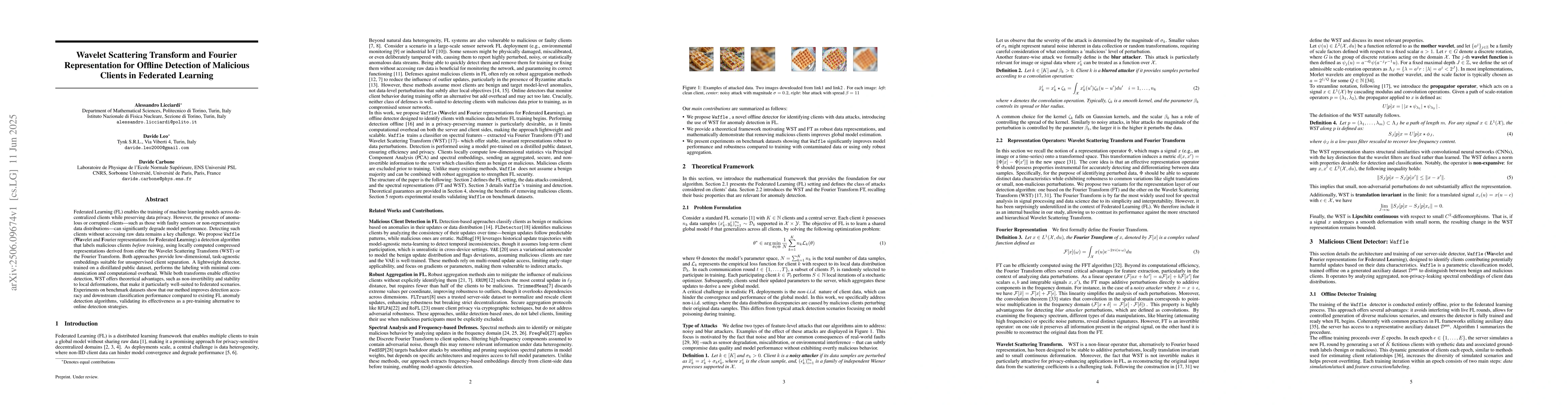 Federated Learning (FL) enables the training of machine learning models across decentralized clients while preserving data privacy. However, the presence of anomalous or corrupted clients - such as those with faulty sensors or non representative data distributions - can significantly degrade model performance. Detecting such clients without accessing raw data remains a key challenge. We propose WAFFLE (Wavelet and Fourier representations for Federated Learning) a detection algorithm that labels malicious clients {\it before training}, using locally computed compressed representations derived from either the Wavelet Scattering Transform (WST) or the Fourier Transform. Both approaches provide low-dimensional, task-agnostic embeddings suitable for unsupervised client separation. A lightweight detector, trained on a distillated public dataset, performs the labeling with minimal communication and computational overhead. While both transforms enable effective detection, WST offers theoretical advantages, such as non-invertibility and stability to local deformations, that make it particularly well-suited to federated scenarios. Experiments on benchmark datasets show that our method improves detection accuracy and downstream classification performance compared to existing FL anomaly detection algorithms, validating its effectiveness as a pre-training alternative to online detection strategies.