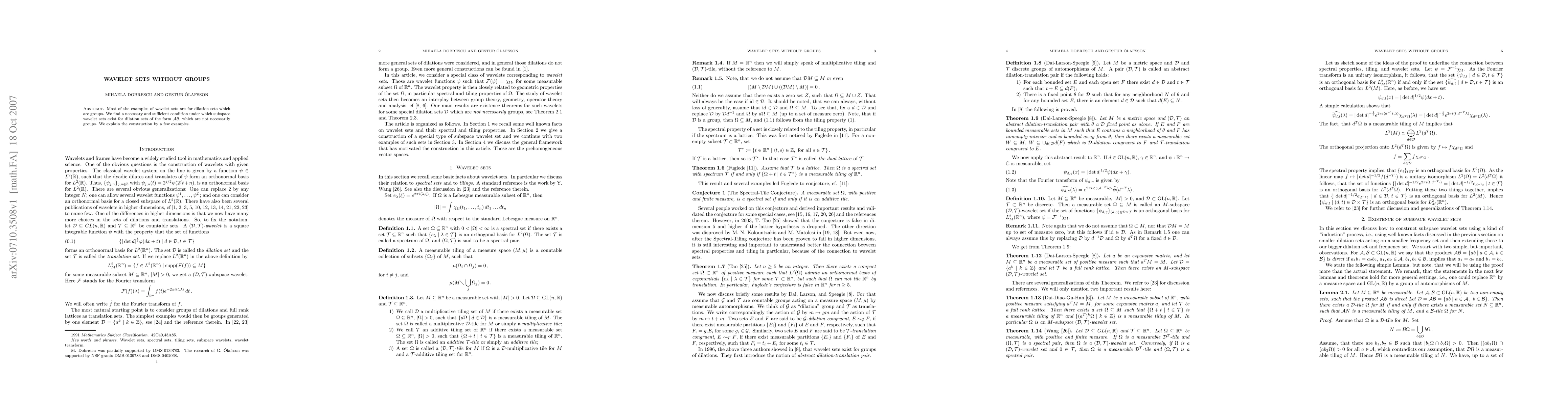 Most of the examples of wavelet sets are for dilation sets which are groups. We find a necessary and sufficient condition under which subspace wavelet sets exist for dilation sets of the form $A B$, which are not necessarily groups. We explain the construction by a few examples.