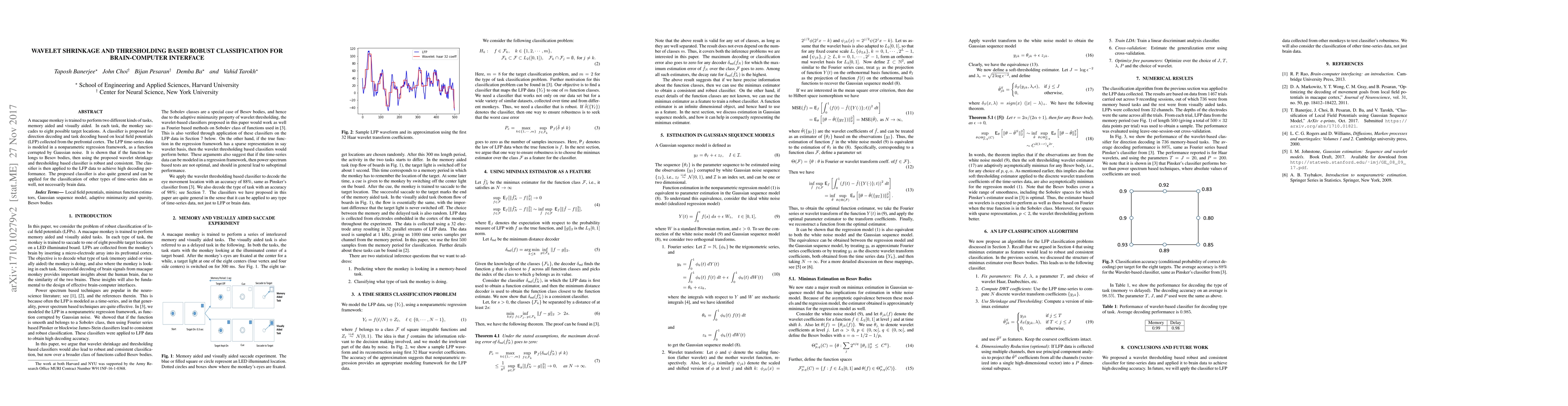 A macaque monkey is trained to perform two different kinds of tasks, memory aided and visually aided. In each task, the monkey saccades to eight possible target locations. A classifier is proposed for direction decoding and task decoding based on local field potentials (LFP) collected from the prefrontal cortex. The LFP time-series data is modeled in a nonparametric regression framework, as a function corrupted by Gaussian noise. It is shown that if the function belongs to Besov bodies, then using the proposed wavelet shrinkage and thresholding based classifier is robust and consistent. The classifier is then applied to the LFP data to achieve high decoding performance. The proposed classifier is also quite general and can be applied for the classification of other types of time-series data as well, not necessarily brain data.