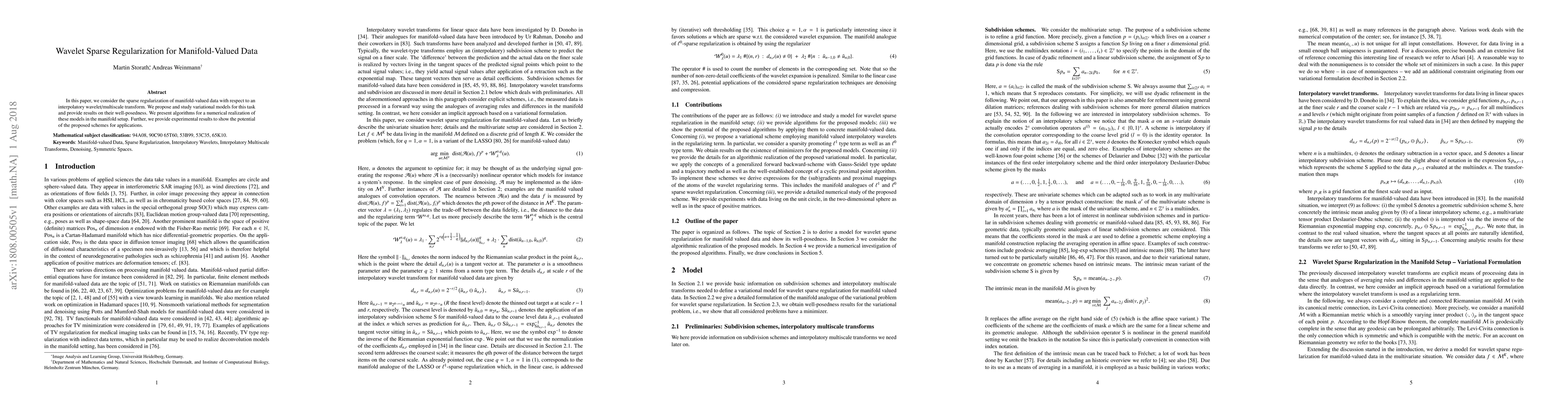 This paper proposes variational models for sparse regularization of manifold-valued data using wavelet transforms, ensuring their well-posedness and presenting algorithms for numerical implementation. Experimental results demonstrate the effectiveness of the proposed schemes in practical applications.