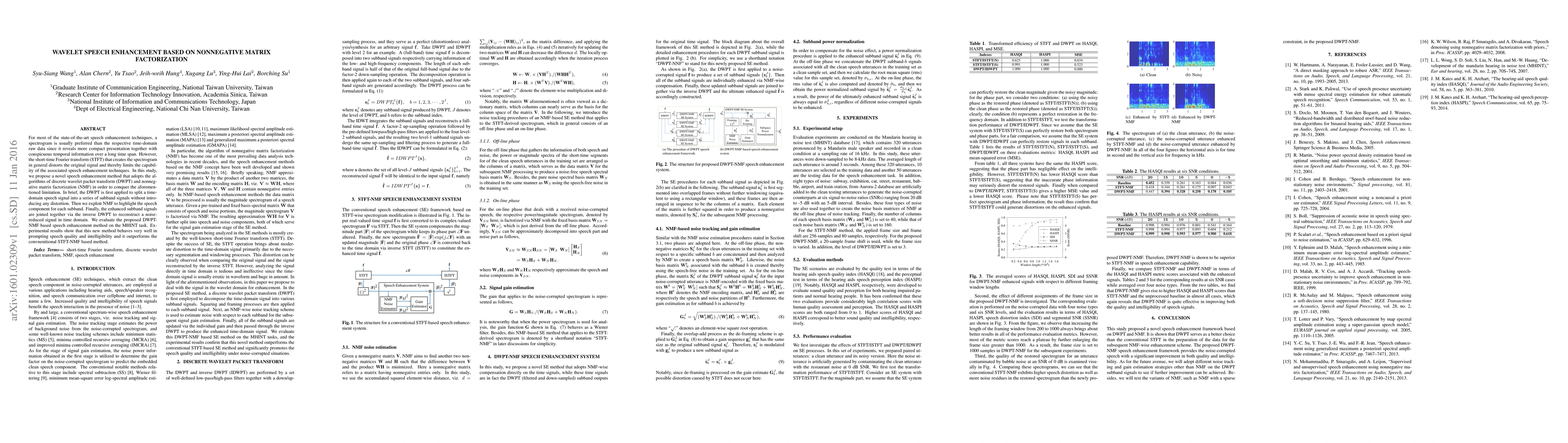 This paper proposes a novel speech enhancement method using discrete wavelet packet transform (DWPT) and nonnegative matrix factorization (NMF) to enhance speech quality without signal distortion. The DWPT splits the signal into subbands, NMF highlights the speech component, and inverse DWPT reconstructs the enhanced signal, outperforming traditional STFT-NMF methods.