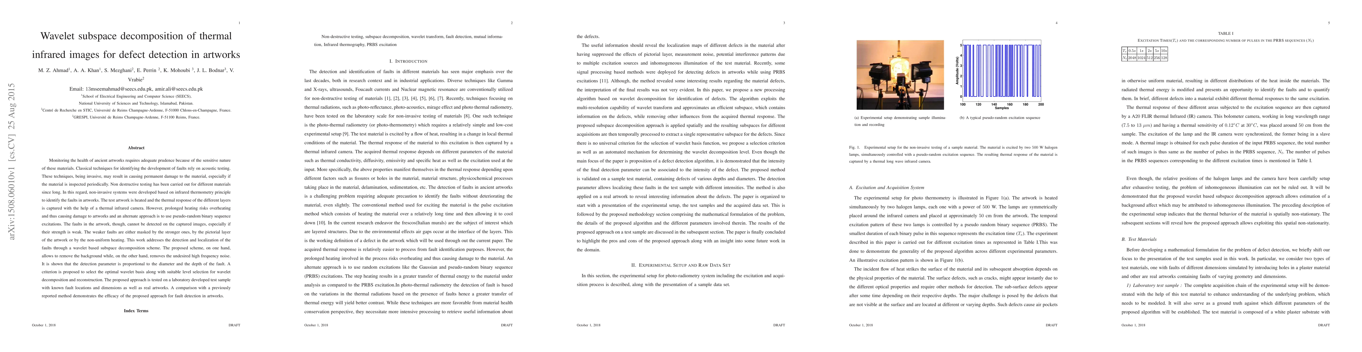 Monitoring the health of ancient artworks requires adequate prudence because of the sensitive nature of these materials. Classical techniques for identifying the development of faults rely on acoustic testing. These techniques, being invasive, may result in causing permanent damage to the material, especially if the material is inspected periodically. Non destructive testing has been carried out for different materials since long. In this regard, non-invasive systems were developed based on infrared thermometry principle to identify the faults in artworks. The test artwork is heated and the thermal response of the different layers is captured with the help of a thermal infrared camera. However, prolonged heating risks overheating and thus causing damage to artworks and an alternate approach is to use pseudo-random binary sequence excitations. The faults in the artwork, though, cannot be detected on the captured images, especially if their strength is weak. The weaker faults are either masked by the stronger ones, by the pictorial layer of the artwork or by the non-uniform heating. This work addresses the detection and localization of the faults through a wavelet based subspace decomposition scheme. The proposed scheme, on one hand, allows to remove the background while, on the other hand, removes the undesired high frequency noise. It is shown that the detection parameter is proportional to the diameter and the depth of the fault. A criterion is proposed to select the optimal wavelet basis along with suitable level selection for wavelet decomposition and reconstruction. The proposed approach is tested on a laboratory developed test sample with known fault locations and dimensions as well as real artworks. A comparison with a previously reported method demonstrates the efficacy of the proposed approach for fault detection in artworks.
