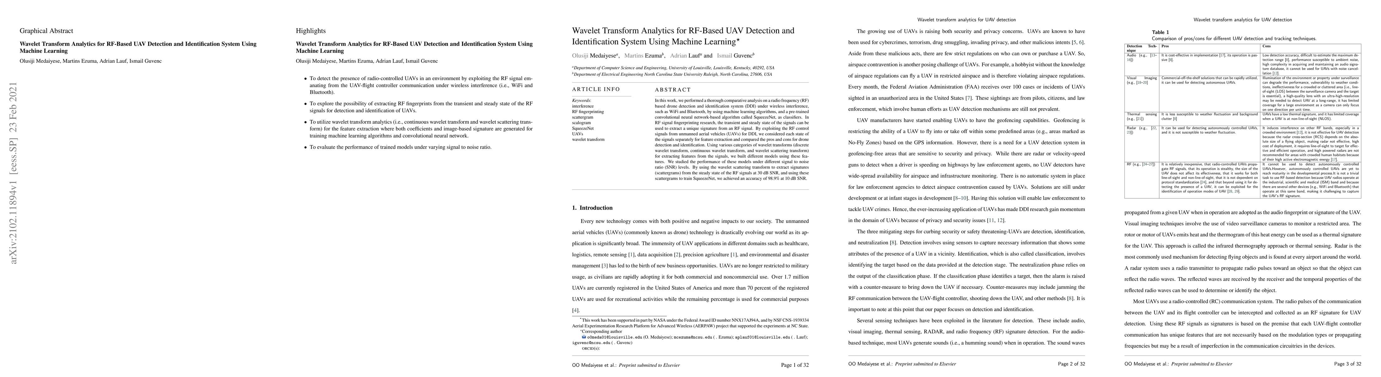 The paper presents a novel approach for UAV detection and identification using wavelet transform analytics for feature extraction, combined with machine learning algorithms and a pre-trained CNN model (SqueezeNet).