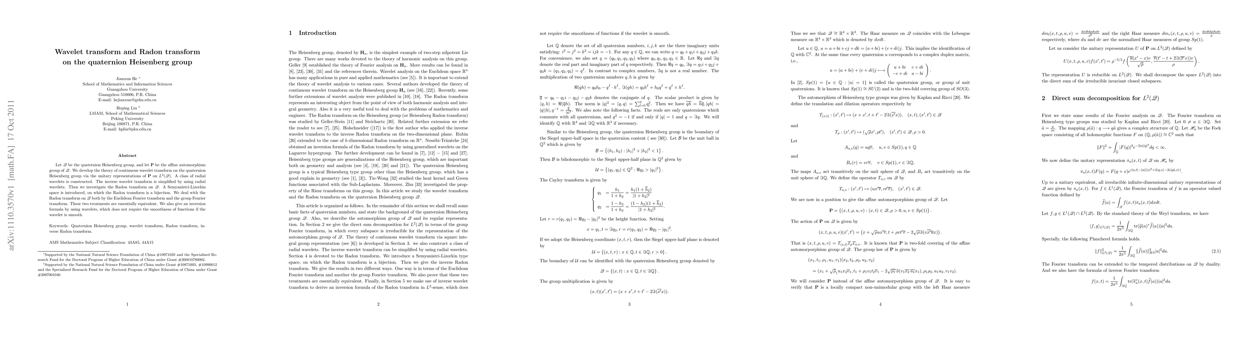 Let $\mathscr Q$ be the quaternion Heisenberg group, and let $\mathbf P$ be the affine automorphism group of $\mathscr Q$. We develop the theory of continuous wavelet transform on the quaternion Heisenberg group via the unitary representations of $\mathbf P$ on $L^2(\mathscr Q)$. A class of radial wavelets is constructed. The inverse wavelet transform is simplified by using radial wavelets. Then we investigate the Radon transform on $\mathscr Q$. A Semyanistri-Lizorkin space is introduced, on which the Radon transform is a bijection. We deal with the Radon transform on $\mathscr Q$ both by the Euclidean Fourier transform and the group Fourier transform. These two treatments are essentially equivalent. We also give an inversion formula by using wavelets, which does not require the smoothness of functions if the wavelet is smooth.