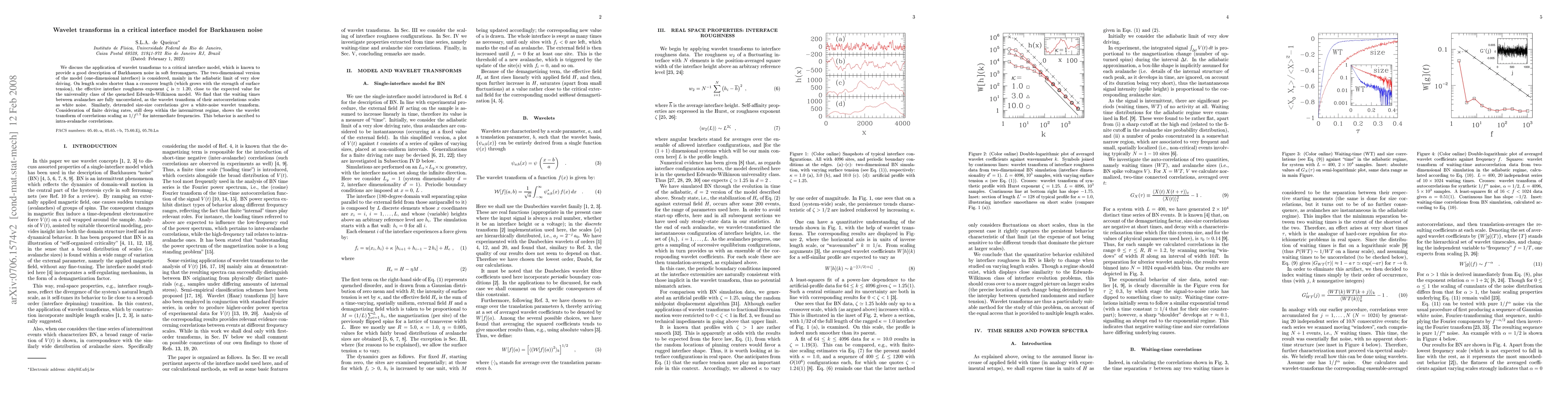 We discuss the application of wavelet transforms to a critical interface model, which is known to provide a good description of Barkhausen noise in soft ferromagnets. The two-dimensional version of the model (one-dimensional interface) is considered, mainly in the adiabatic limit of very slow driving. On length scales shorter than a crossover length (which grows with the strength of surface tension), the effective interface roughness exponent $\zeta$ is $\simeq 1.20$, close to the expected value for the universality class of the quenched Edwards-Wilkinson model. We find that the waiting times between avalanches are fully uncorrelated, as the wavelet transform of their autocorrelations scales as white noise. Similarly, detrended size-size correlations give a white-noise wavelet transform. Consideration of finite driving rates, still deep within the intermittent regime, shows the wavelet transform of correlations scaling as $1/f^{1.5}$ for intermediate frequencies. This behavior is ascribed to intra-avalanche correlations.