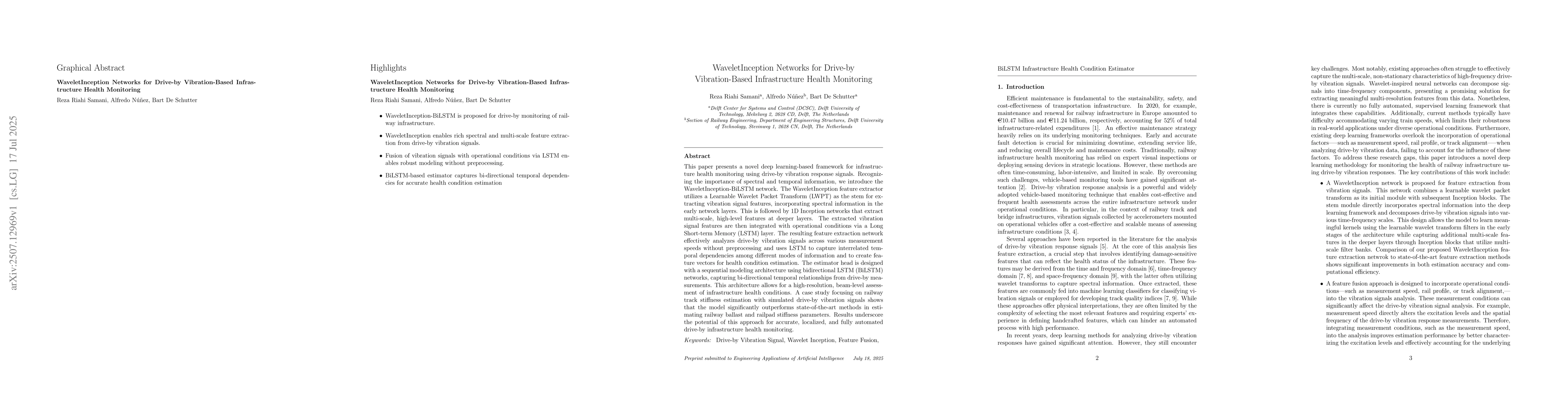 This paper presents a novel deep learning-based framework for infrastructure health monitoring using drive-by vibration response signals. Recognizing the importance of spectral and temporal information, we introduce the WaveletInception-BiLSTM network. The WaveletInception feature extractor utilizes a Learnable Wavelet Packet Transform (LWPT) as the stem for extracting vibration signal features, incorporating spectral information in the early network layers. This is followed by 1D Inception networks that extract multi-scale, high-level features at deeper layers. The extracted vibration signal features are then integrated with operational conditions via a Long Short-term Memory (LSTM) layer. The resulting feature extraction network effectively analyzes drive-by vibration signals across various measurement speeds without preprocessing and uses LSTM to capture interrelated temporal dependencies among different modes of information and to create feature vectors for health condition estimation. The estimator head is designed with a sequential modeling architecture using bidirectional LSTM (BiLSTM) networks, capturing bi-directional temporal relationships from drive-by measurements. This architecture allows for a high-resolution, beam-level assessment of infrastructure health conditions. A case study focusing on railway track stiffness estimation with simulated drive-by vibration signals shows that the model significantly outperforms state-of-the-art methods in estimating railway ballast and railpad stiffness parameters. Results underscore the potential of this approach for accurate, localized, and fully automated drive-by infrastructure health monitoring.