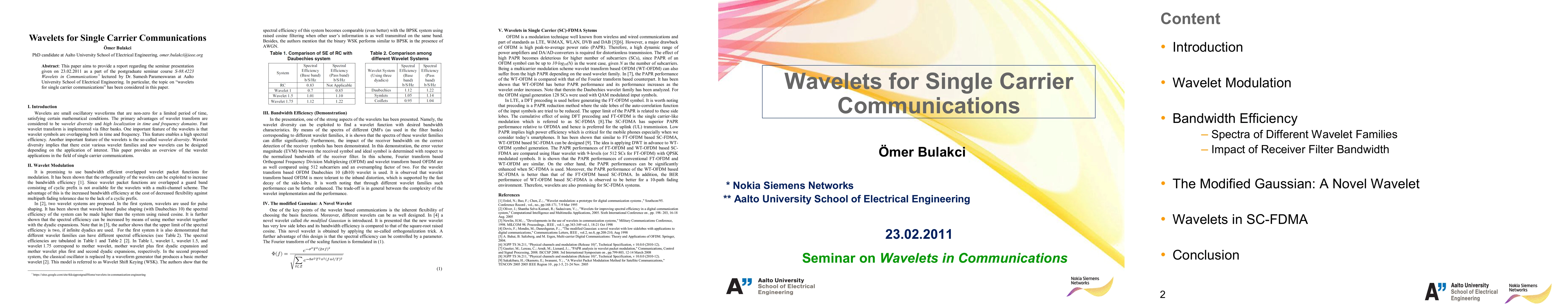 This paper summarizes a seminar presentation on wavelets for single carrier communications given by Dr. Sumesh Parameswaran at Aalto University. It focuses on the application of wavelets in Single Carrier Frequency Division Multiple Access (SC-FDMA) systems.