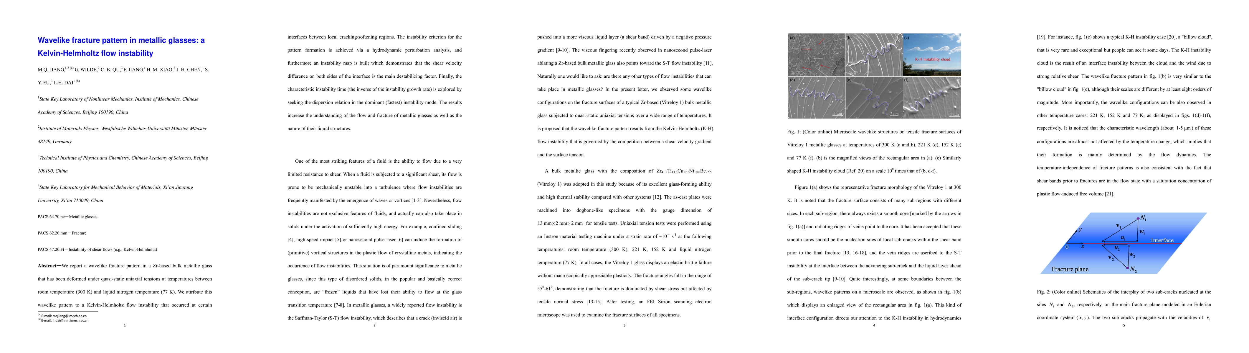 This study investigates wavelike fracture patterns in Zr-based metallic glasses under quasi-static tension, attributing them to a Kelvin-Helmholtz flow instability. The research builds an instability map showing that shear velocity differences drive the pattern formation.