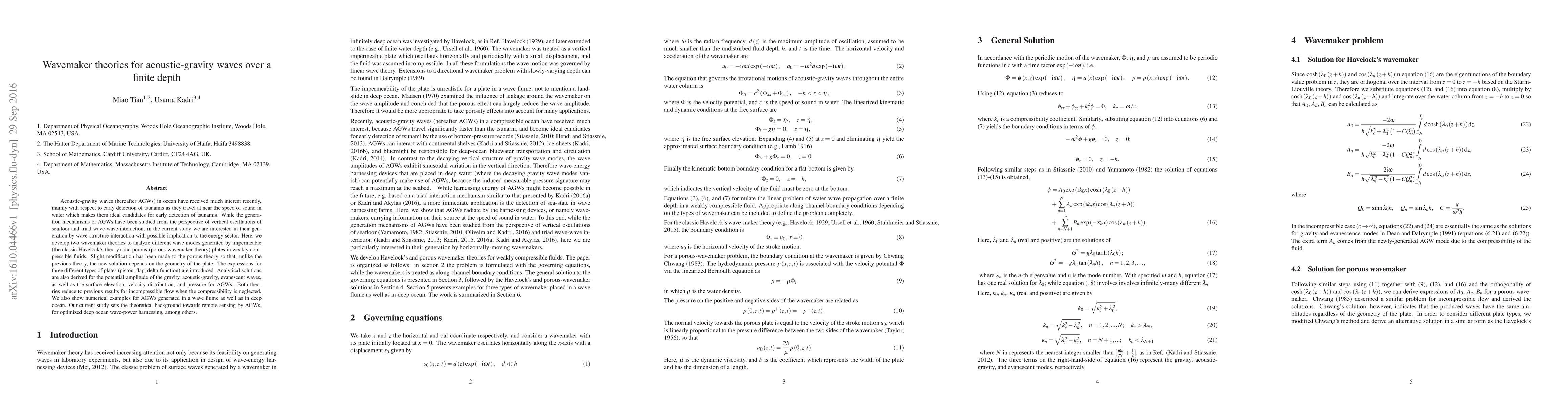 Acoustic-gravity waves (hereafter AGWs) in ocean have received much interest recently, mainly with respect to early detection of tsunamis as they travel at near the speed of sound in water which makes them ideal candidates for early detection of tsunamis. While the generation mechanisms of AGWs have been studied from the perspective of vertical oscillations of seafloor and triad wave-wave interaction, in the current study we are interested in their generation by wave-structure interaction with possible implication to the energy sector. Here, we develop two wavemaker theories to analyze different wave modes generated by impermeable (the classic Havelock's theory) and porous (porous wavemaker theory) plates in weakly compressible fluids. Slight modification has been made to the porous theory so that, unlike the previous theory, the new solution depends on the geometry of the plate. The expressions for three different types of plates (piston, flap, delta-function) are introduced. Analytical solutions are also derived for the potential amplitude of the gravity, acoustic-gravity, evanescent waves, as well as the surface elevation, velocity distribution, and pressure for AGWs. Both theories reduce to previous results for incompressible flow when the compressibility is neglected. We also show numerical examples for AGWs generated in a wave flume as well as in deep ocean. Our current study sets the theoretical background towards remote sensing by AGWs, for optimized deep ocean wave-power harnessing, among others.