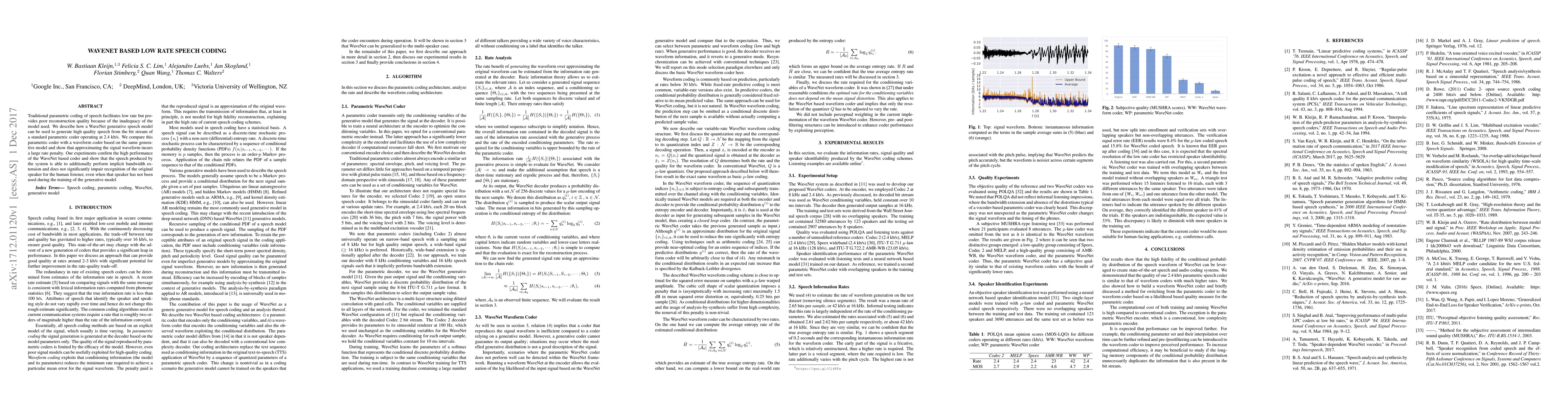 This paper proposes a WaveNet-based low-rate speech coding method that generates high-quality speech from a 2.4 kb/s parametric coder, demonstrating superior reconstruction quality compared to a waveform coder. The results show the system's ability to implicitly extend bandwidth and maintain speaker recognition, even for untrained speakers.