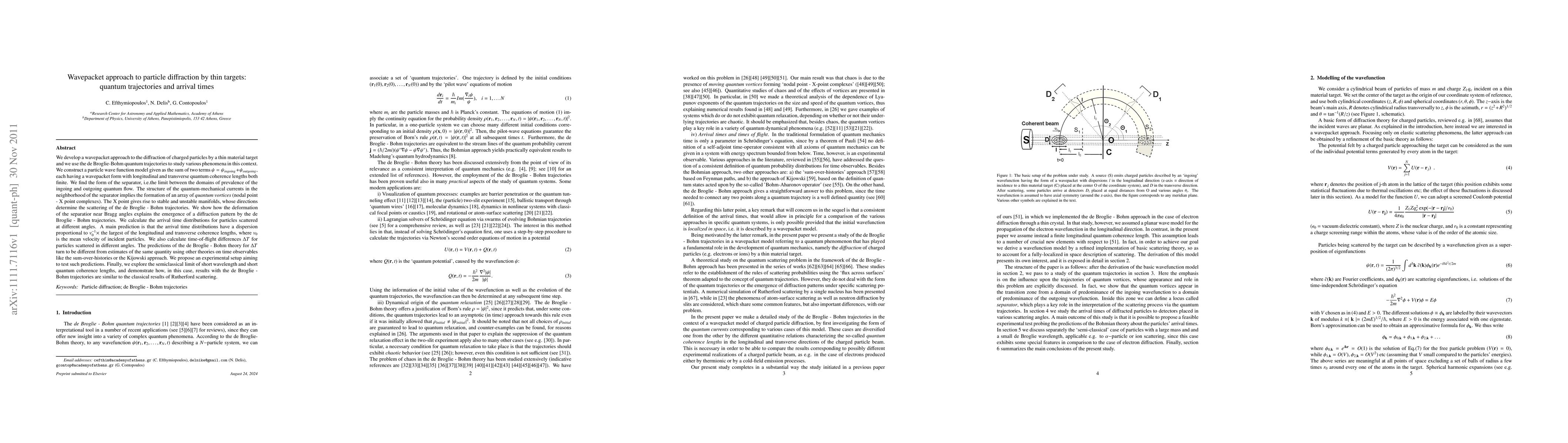 We develop a wavepacket approach to the diffraction of charged particles by a thin material target and we use the de Broglie-Bohm quantum trajectories to study various phenomena in this context. We find the form of the separator, i.e.the limit between the domains of prevalence of the ingoing and outgoing quantum flow. The structure of the quantum-mechanical currents in the neighborhood of the separator implies the formation of an array of \emph{quantum vortices} (nodal point - X point complexes). We show how the deformation of the separatior near Bragg angles explains the emergence of a diffraction pattern by the de Broglie - Bohm trajectories. We calculate the arrival time distributions for particles scattered at different angles. The predictions of the de Broglie - Bohm theory for $\Delta T$ turn to be different from estimates of the same quantity using other theories on time observables like the sum-over-histories or the Kijowski approach. We propose an experimental setup aiming to test such predictions. Finally, we explore the semiclassical limit of short wavelength and short quantum coherence lengths, and demonstrate how, in this case, results with the de Broglie - Bohm trajectories are similar to the classical results of Rutherford scattering.
