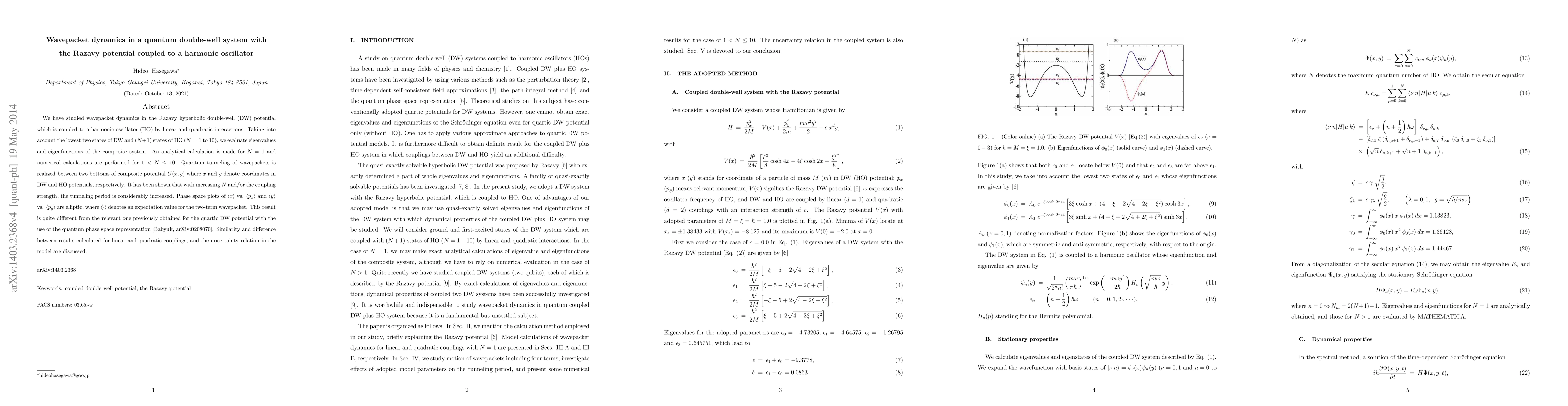 This paper investigates wavepacket dynamics in a quantum double-well system with Razavy's potential coupled to a harmonic oscillator through linear and quadratic interactions. The study reveals increased tunneling periods with higher coupling strength and N, and phase space plots show elliptic trajectories differing from those in quartic double-well systems.