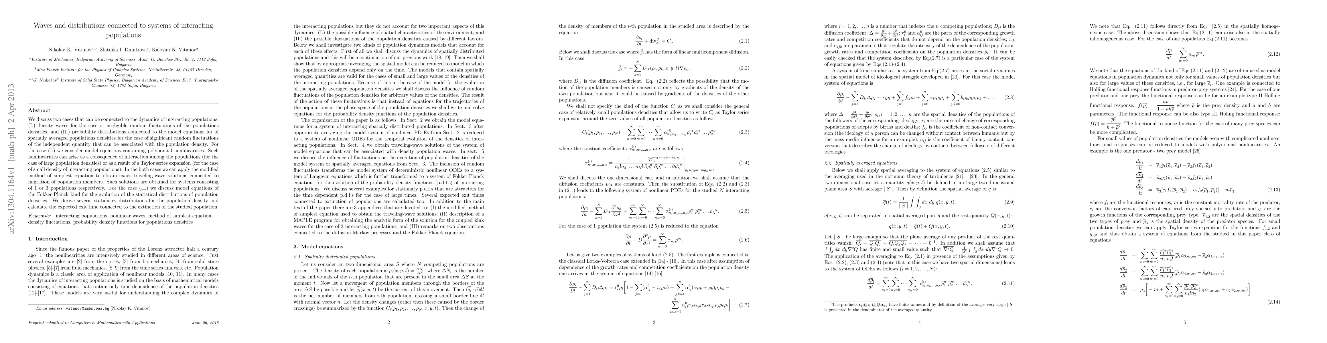 We discuss two cases that can be connected to the dynamics of interacting populations: (I.) density waves for the case or negligible random fluctuations of the populations densities, and (II.) probability distributions connected to the model equations for of spatially averaged populations densities for the case of significant random fluctuations of the independent quantity that can be associated with the population density. For the case (I.) we consider model equations containing polynomial nonlinearities. Such nonlinearities can arise as a consequence of interaction among the populations (for the case of large population densities) or as a result of a Taylor series expansion (for the case of small density of interacting populations). In the both cases we can apply the modified method of simplest equation to obtain exact traveling-wave solutions connected to migration of population members. Such solutions are obtained for systems consisting of 1 or 3 populations respectively. For the case (II.) we discuss model equations of the Fokker-Planck kind for the evolution of the statistical distributions of population densities. We derive several stationary distributions for the population density and calculate the expected exit time connected to the extinction of the studied population.