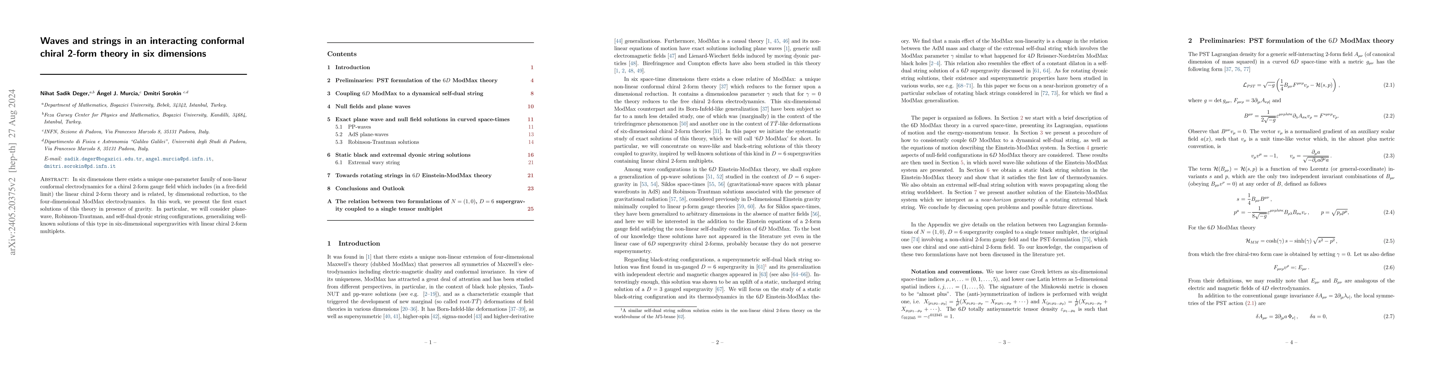This paper explores exact solutions for a unique family of conformal chiral 2-form theories in six dimensions, focusing on plane-wave, Robinson-Trautman, and self-dual dyonic string configurations in the presence of gravity. These solutions generalize known configurations from linear chiral 2-form multiplets in six-dimensional supergravities.