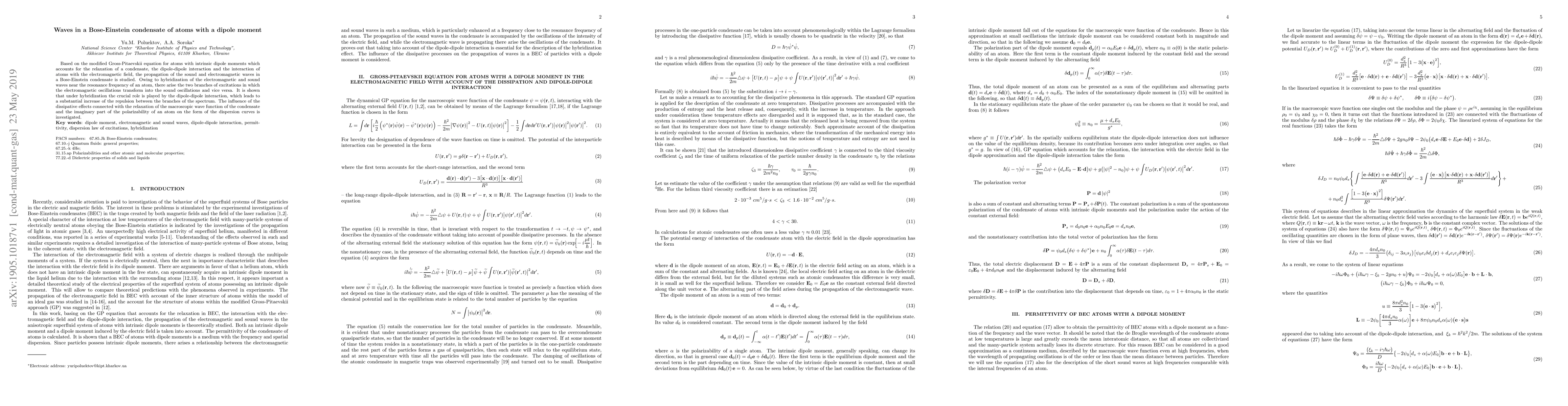 This paper investigates the propagation of sound and electromagnetic waves in a Bose-Einstein condensate with dipole-moment atoms, revealing the hybridization of these waves near resonance. The dipole-dipole interaction significantly increases repulsion between the resulting branches of excitations, while dissipative effects influence the dispersion curves.