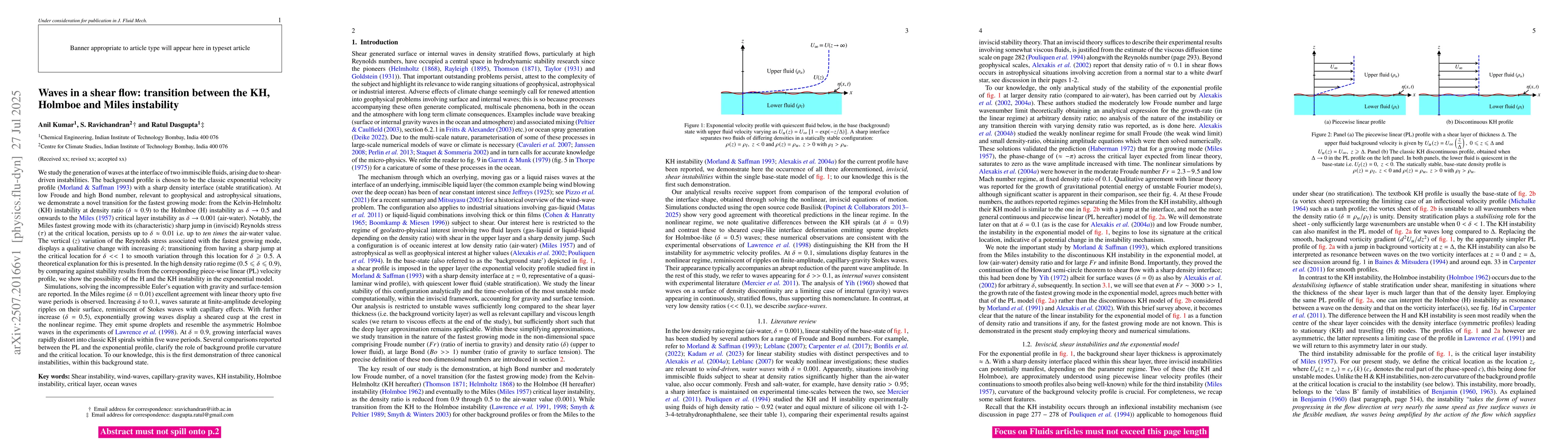 We investigate shear driven wave generation at the interface between two immiscible fluids, using an exponential velocity profile with a sharp density interface representing stable stratification. At low Froude and high Bond numbers, conditions relevant to geophysical and astrophysical flows, we identify a novel transition in the fastest growing mode: from Kelvin Helmholtz (KH) instability at high density ratio (delta = 0.9), to Holmboe (H) instability as delta approaches 0.5, and ultimately to the Miles (1957) critical layer instability as delta approaches 0.001, representative of the air water system. Remarkably, the Miles mode, characterized by a sharp jump in inviscid Reynolds stress (tau) at the critical layer, persists up to delta = 0.01, i.e., ten times the air water value. As delta increases, the vertical variation of tau undergoes a qualitative change, from a sharp jump at the critical layer for delta much less than 1 to a smooth transition through it for delta greater than or equal to 0.5. A theoretical explanation is provided. In the moderate to high density ratio regime, comparison with a piecewise-linear (PL) velocity profile confirms the presence of both H and KH instabilities in the exponential profile. Nonlinear simulations of the incompressible Euler equations with gravity and surface tension show excellent agreement with linear theory for delta = 0.01 up to five wave periods. At delta = 0.1, waves saturate into finite-amplitude structures with capillary ripples, while at delta = 0.5, the waves develop sheared cusps and emit spume, resembling asymmetric Holmboe waves observed experimentally. At delta = 0.9, the waves rapidly evolve into classic KH spirals. Comparisons with the PL profile highlight the role of background curvature and the critical layer. This work presents, for the first time, all three canonical instabilities within a single background state.