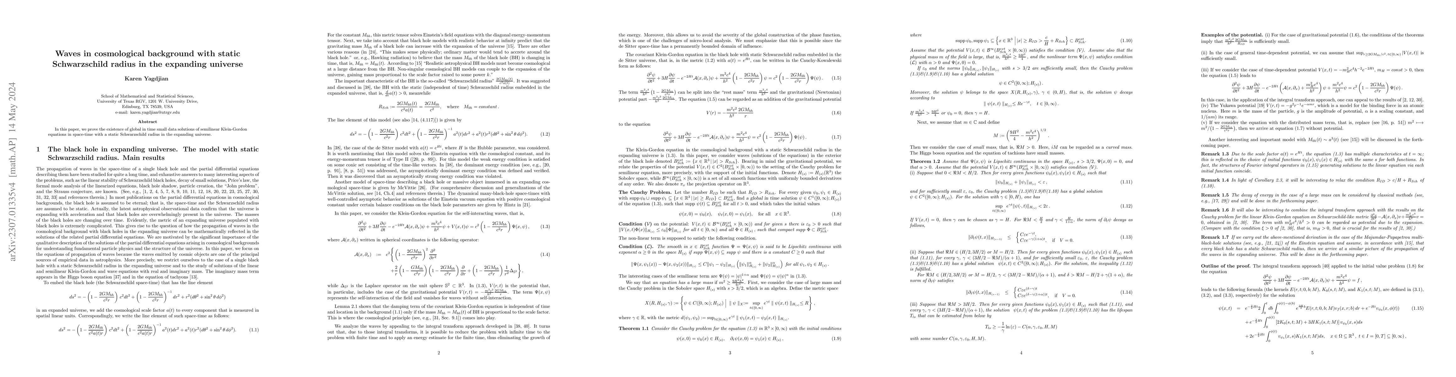 Summary: This paper demonstrates the existence of small data solutions that persist globally in time for semilinear Klein-Gordon equations in a space-time featuring a static Schwarzschild radius within an expanding universe. The focus is on understanding wave behavior under cosmological conditions.