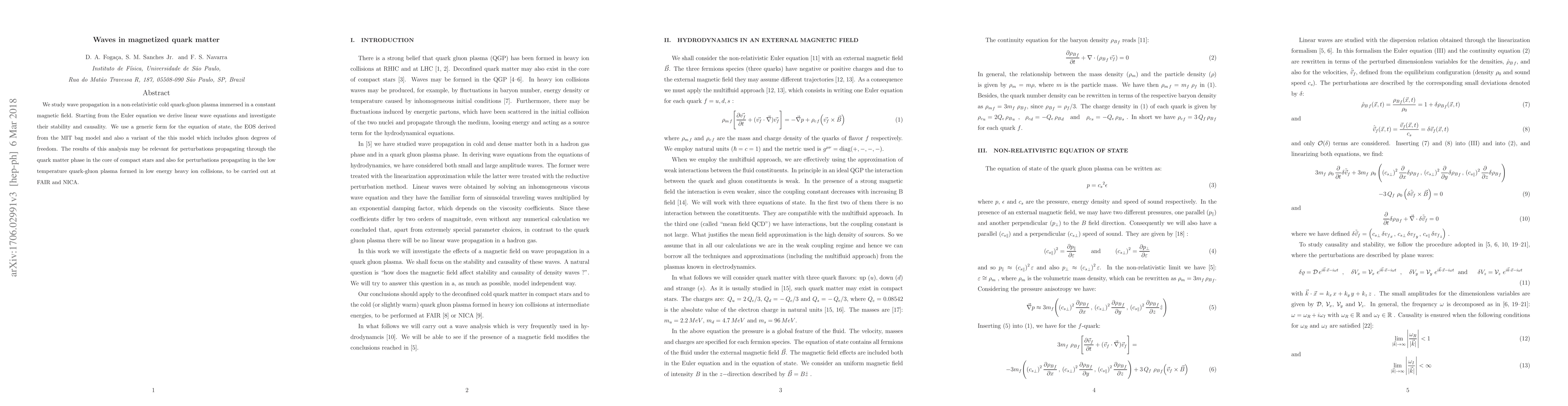 This paper investigates wave propagation in cold quark-gluon plasma under a constant magnetic field, deriving linear wave equations from the Euler equation and analyzing their stability and causality. The results are relevant for understanding perturbations in compact star cores and low-energy heavy ion collisions.