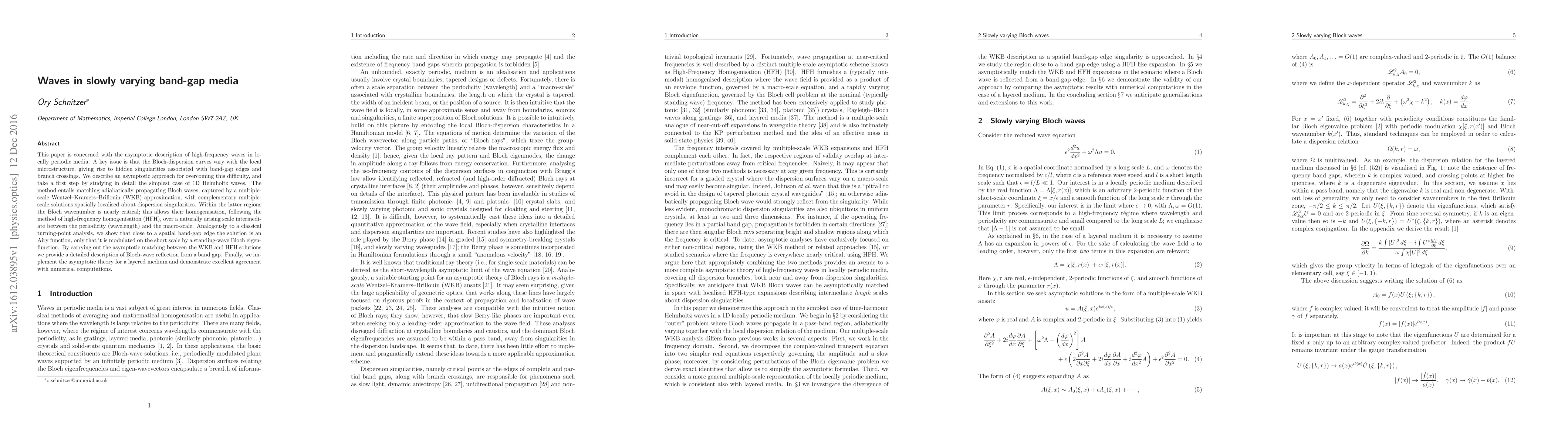 This paper is concerned with the asymptotic description of high-frequency waves in locally periodic media. A key issue is that the Bloch-dispersion curves vary with the local microstructure, giving rise to hidden singularities associated with band-gap edges and branch crossings. We describe an asymptotic approach for overcoming this difficulty, and take a first step by studying in detail the simplest case of 1D Helmholtz waves. The method entails matching adiabatically propagating Bloch waves, captured by a multiple-scale Wentzel-Kramers-Brillouin (WKB) approximation, with complementary multiple-scale solutions spatially localised about dispersion singularities. Within the latter regions the Bloch wavenumber is nearly critical; this allows their homogenisation, following the method of high-frequency homogenisation (HFH), over a naturally arising scale intermediate between the periodicity (wavelength) and the macro-scale. Analogously to a classical turning-point analysis, we show that close to a spatial band-gap edge the solution is an Airy function, only that it is modulated on the short scale by a standing-wave Bloch eigenfunction. By carrying out the asymptotic matching between the WKB and HFH solutions we provide a detailed description of Bloch-wave reflection from a band gap. Finally, we implement the asymptotic theory for a layered medium and demonstrate excellent agreement with numerical computations.