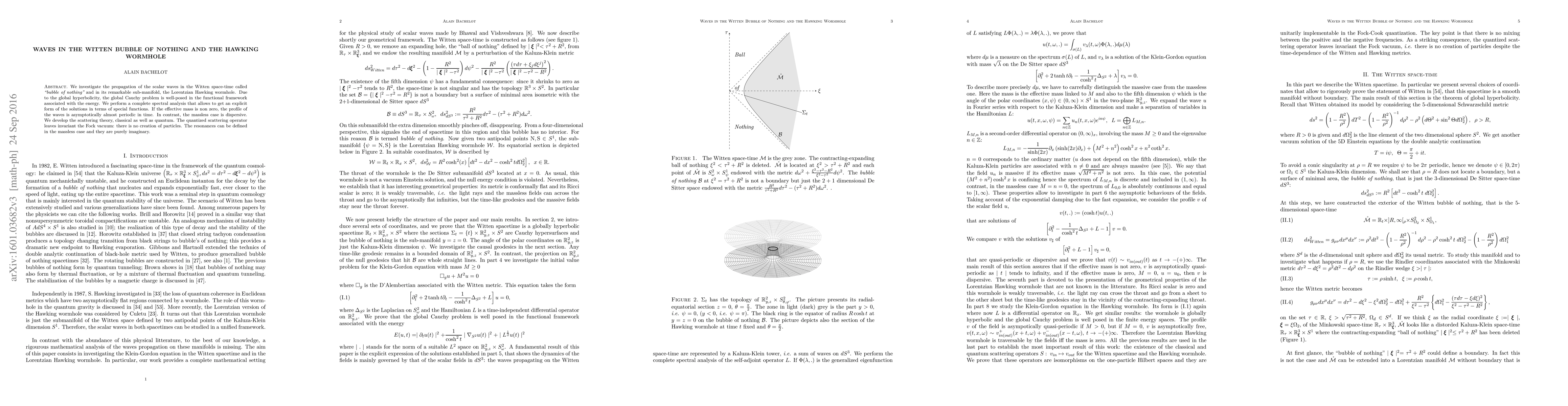 We investigate the propagation of the scalar waves in the Witten space-time called "bubble of nothing" and in its remarkable sub-manifold, the Lorentzian Hawking wormhole. Due to the global hyperbolicity, the global Cauchy problem is well-posed in the functional framework associated with the energy. We perform a complete spectral analysis that allows to get an explicit form of the solutions in terms of special functions. If the effective mass is non zero, the profile of the waves is asymptotically almost periodic in time. In contrast, the massless case is dispersive. We develop the scattering theory, classical as well as quantum. The quantized scattering operator leaves invariant the Fock vacuum: there is no creation of particles. The resonances can be defined in the massless case and they are purely imaginary.