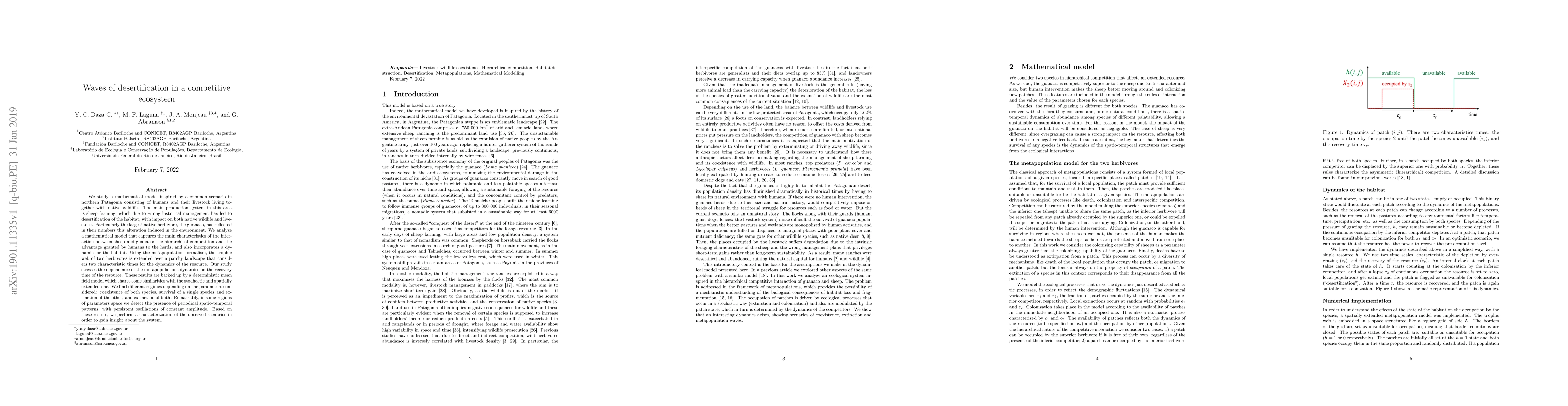 We study a mathematical model inspired by a common scenario in northern Patagonia consisting of humans and their livestock living together with native wildlife. The main production system in this area is sheep farming, which due to wrong historical management has led to desertification of the habitat, with impact on both native wildlife and livestock. Particularly the largest native herbivore, the guanaco, has reflected in their numbers this alteration induced in the environment. We analyze a mathematical model that captures the main characteristics of the interaction between sheep and guanaco: the hierarchical competition and the advantage granted by humans to the herds, and also incorporates a dynamic for the habitat. Using the metapopulation formalism, the trophic web of two herbivores is extended over a patchy landscape that considers two characteristic times for the dynamics of the resource. Our study stresses the dependence of the metapopulations dynamics on the recovery time of the resource. These results are backed up by a deterministic mean field model which shares some similarities with the stochastic and spatially extended one. We find different regimes depending on the parameters considered: coexistence of both species, survival of a single species and extinction of the other, and extinction of both. Remarkably, in some regions of parameters space we detect the presence of periodical spatio-temporal patterns, with persistent oscillations of constant amplitude. Based on these results, we perform a characterization of the observed scenarios in order to gain insight about the system.