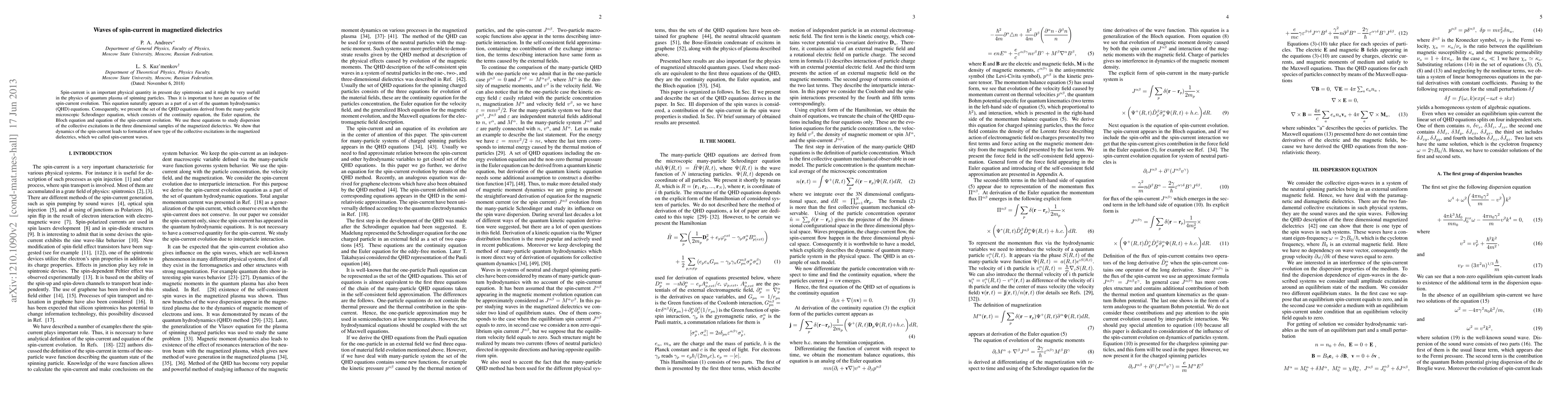 Spin-current is an important physical quantity in present day spintronics and it might be very usefull in the physics of quantum plasma of spinning particles. Thus it is important to have an equation of the spin-current evolution. This equation naturally appears as a part of a set of the quantum hydrodynamics (QHD) equations. Consequently, we present the set of the QHD equations derived from the many-particle microscopic Schrodinger equation, which consists of the continuity equation, the Euler equation, the Bloch equation and equation of the spin-current evolution. We use these equations to study dispersion of the collective excitations in the three dimensional samples of the magnetized dielectrics. We show that dynamics of the spin-current leads to formation of new type of the collective excitations in the magnetized dielectrics, which we called spin-current waves.