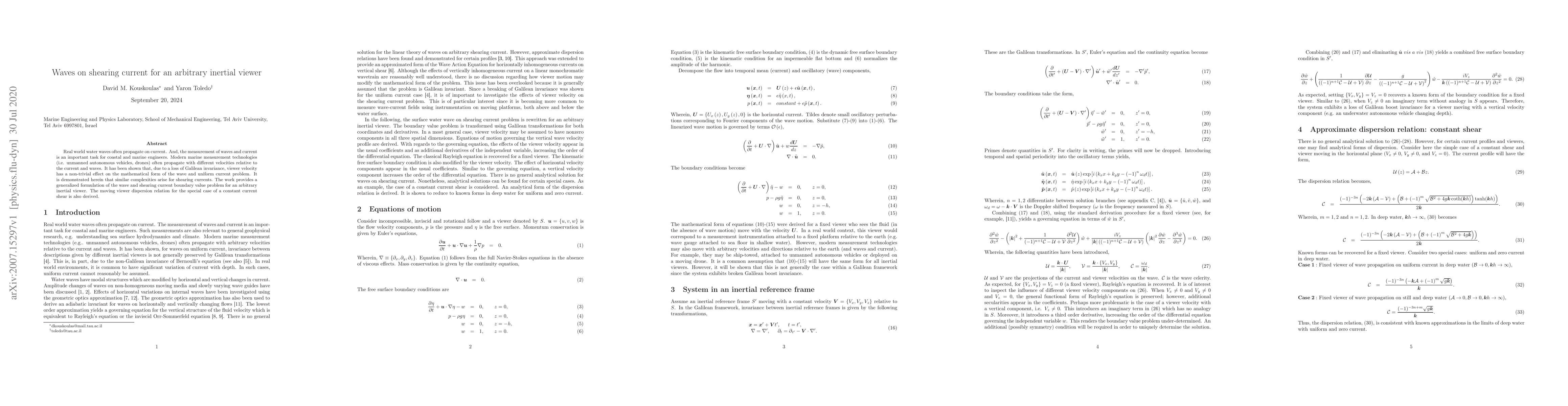 Real world water waves often propagate on current. And, the measurement of waves and current is an important task for coastal and marine engineers. Modern marine measurement technologies (i.e. unmanned autonomous vehicles, drones) often propagate with different velocities relative to the current and waves. It has been shown that, due to a loss of Galilean invariance, viewer velocity has a non-trivial effect on the mathematical form of the wave and uniform current problem. It is demonstrated herein that similar complexities arise for shearing currents. The work provides a generalized formulation of the wave and shearing current boundary value problem for an arbitrary inertial viewer. The moving viewer dispersion relation for the special case of a constant current shear is also derived.