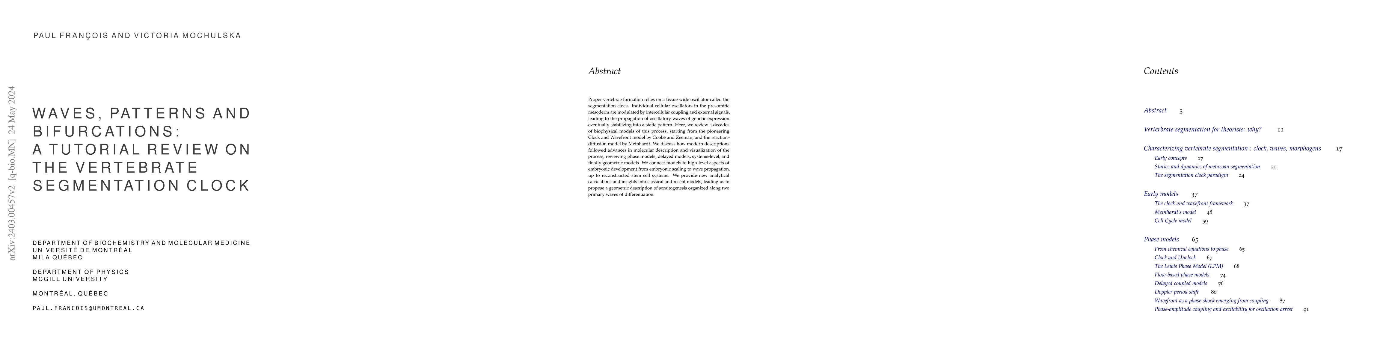Proper vertebrae formation relies on a tissue-wide oscillator called the segmentation clock. Individual cellular oscillators in the presomitic mesoderm are modulated by intercellular coupling and external signals, leading to the propagation of oscillatory waves of genetic expression eventually stabilizing into a static pattern. Here, we review 4 decades of biophysical models of this process, starting from the pioneering Clock and Wavefront model by Cooke and Zeeman, and the reaction-diffusion model by Meinhardt. We discuss how modern descriptions followed advances in molecular description and visualization of the process, reviewing phase models, delayed models, systems-level, and finally geometric models. We connect models to high-level aspects of embryonic development from embryonic scaling to wave propagation, up to reconstructed stem cell systems. We provide new analytical calculations and insights into classical and recent models, leading us to propose a geometric description of somitogenesis organized along two primary waves of differentiation.