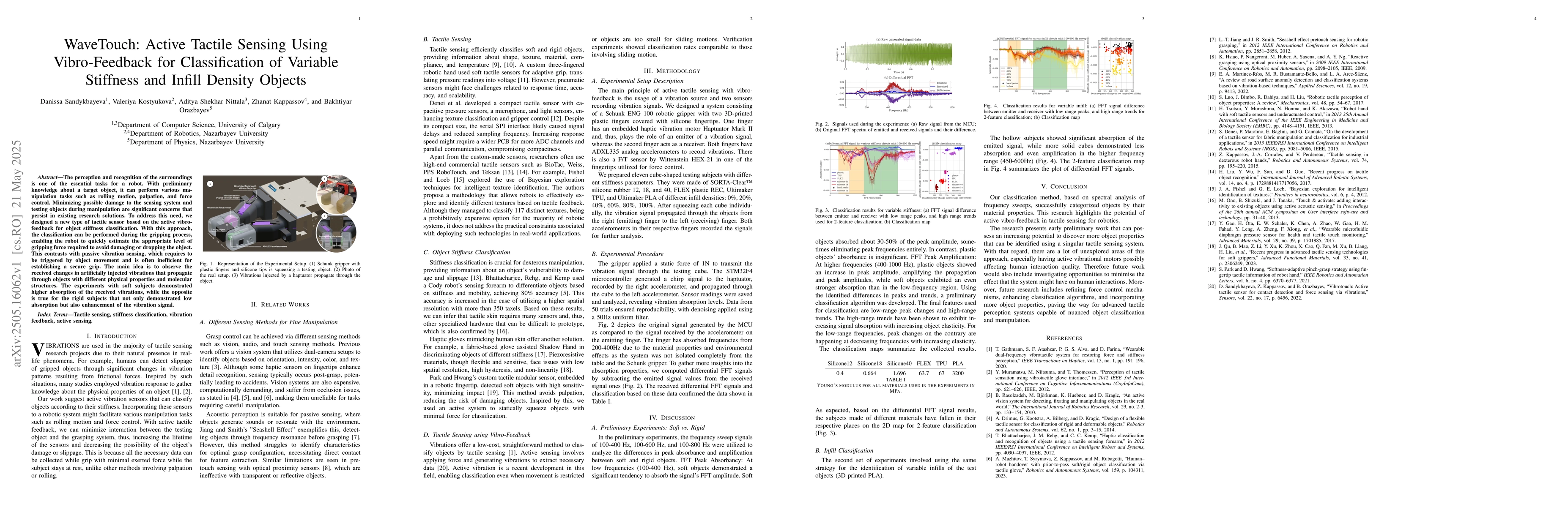 Researchers developed a tactile sensor that uses artificial vibrations to classify variable stiffness and infill density objects, enabling robots to quickly estimate gripping force without damaging the object.