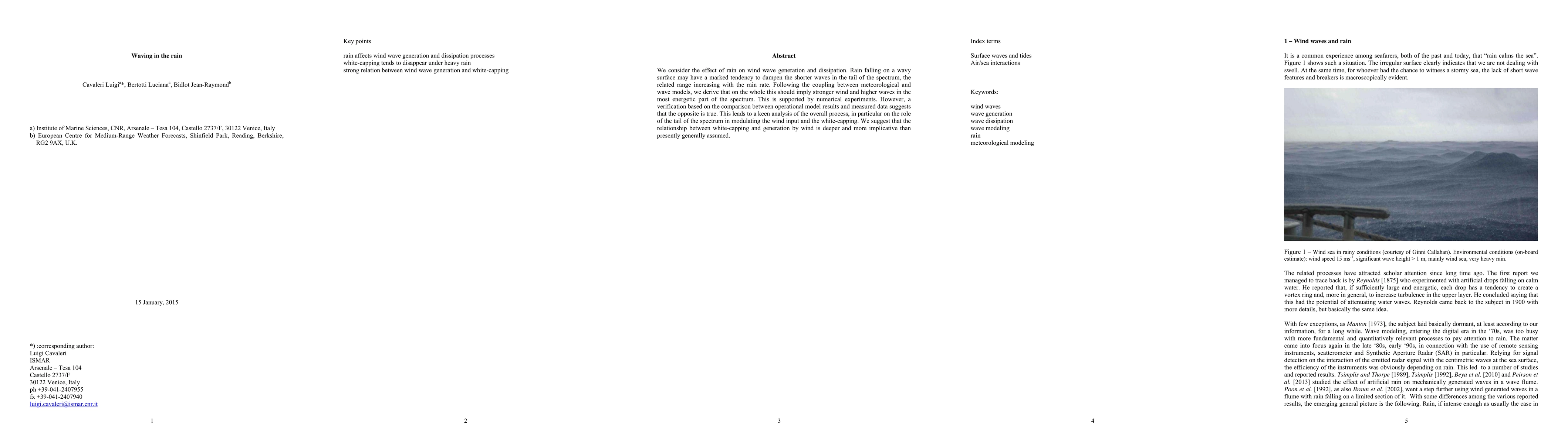 Rainfall on wavy surfaces dampens shorter waves, leading to stronger winds and higher waves in the most energetic part of the spectrum, but contradicted by operational model results that suggest no increase.
