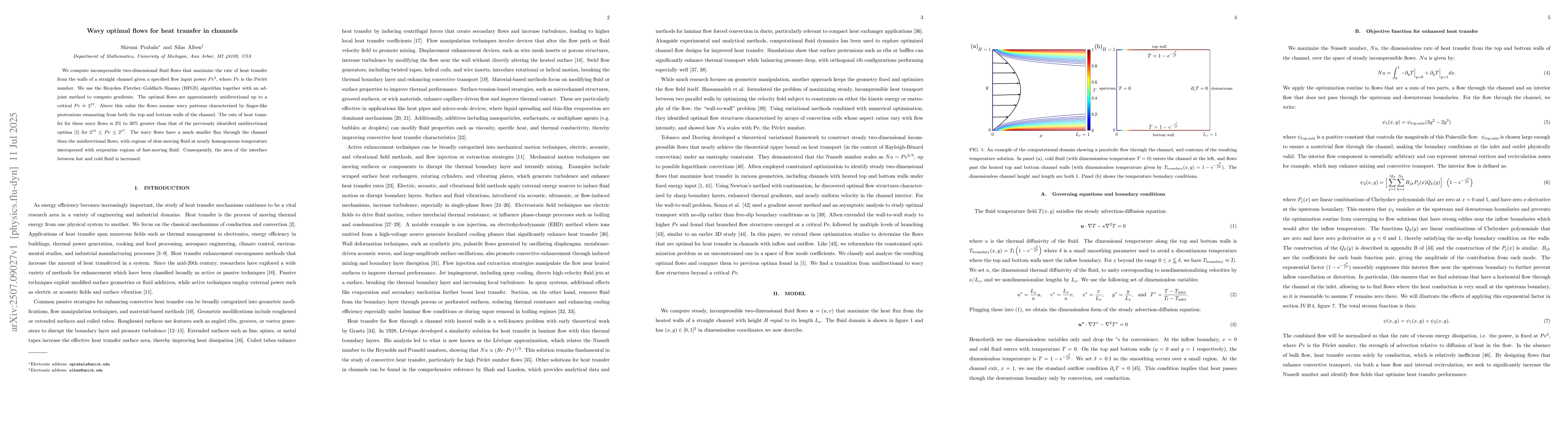 We compute incompressible two-dimensional fluid flows that maximize the rate of heat transfer from the walls of a straight channel given a specified flow input power $Pe^{2}$, where $Pe$ is the P\'{e}clet number. We use the Broyden-Fletcher-Goldfarb-Shanno (BFGS) algorithm together with an adjoint method to compute gradients. The optimal flows are approximately unidirectional up to a critical $Pe \approx 2^{12}$. Above this value the flows assume wavy patterns characterized by finger-like protrusions emanating from both the top and bottom walls of the channel. The rate of heat transfer for these wavy flows is 3% to 30% greater than that of the previously identified unidirectional optima for $2^{13} \leq Pe \leq 2^{17}$. The wavy flows have a much smaller flux through the channel than the unidirectional flows, with regions of slow-moving fluid at nearly homogeneous temperature interspersed with serpentine regions of fast-moving fluid. Consequently, the area of the interface between hot and cold fluid is increased.