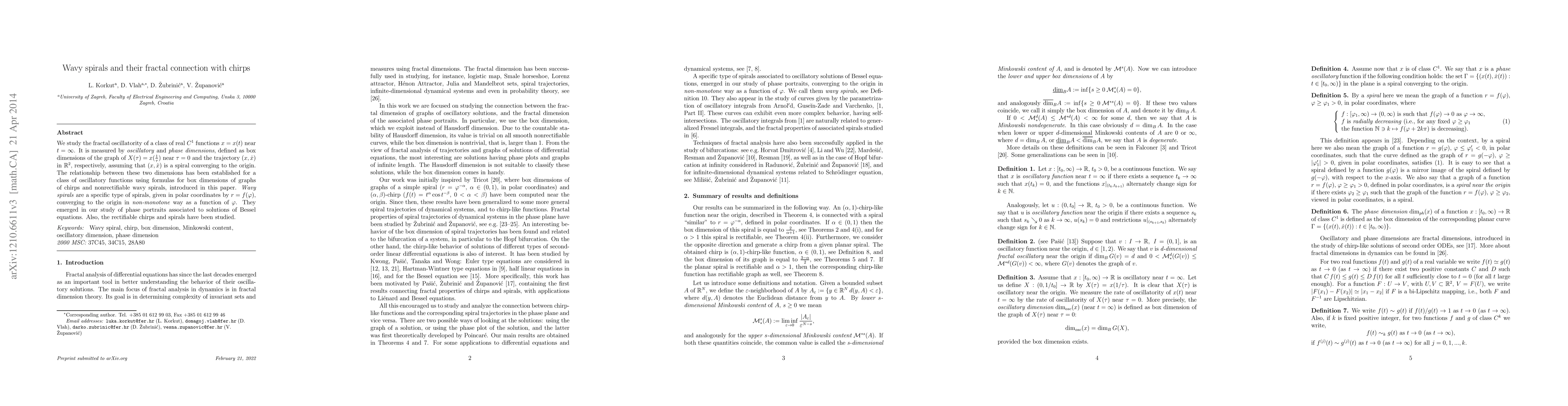 We study the fractal oscillatority of a class of real $C^1$ functions $x=x(t)$ near $t=\infty$. It is measured by oscillatory and phase dimensions, defined as box dimensions of the graph of $X(\tau)=x(\frac{1}{\tau})$ near $\tau=0$ and the trajectory $(x,\dot{x})$ in $\mathbb{R}^2$, respectively, assuming that $(x,\dot{x})$ is a spiral converging to the origin. The relationship between these two dimensions has been established for a class of oscillatory functions using formulas for box dimensions of graphs of chirps and nonrectifiable wavy spirals, introduced in this paper. Wavy spirals are a specific type of spirals, given in polar coordinates by $r=f(\varphi)$, converging to the origin in non-monotone way as a function of $\varphi$. They emerged in our study of phase portraits associated to solutions of Bessel equations. Also, the rectifiable chirps and spirals have been studied.