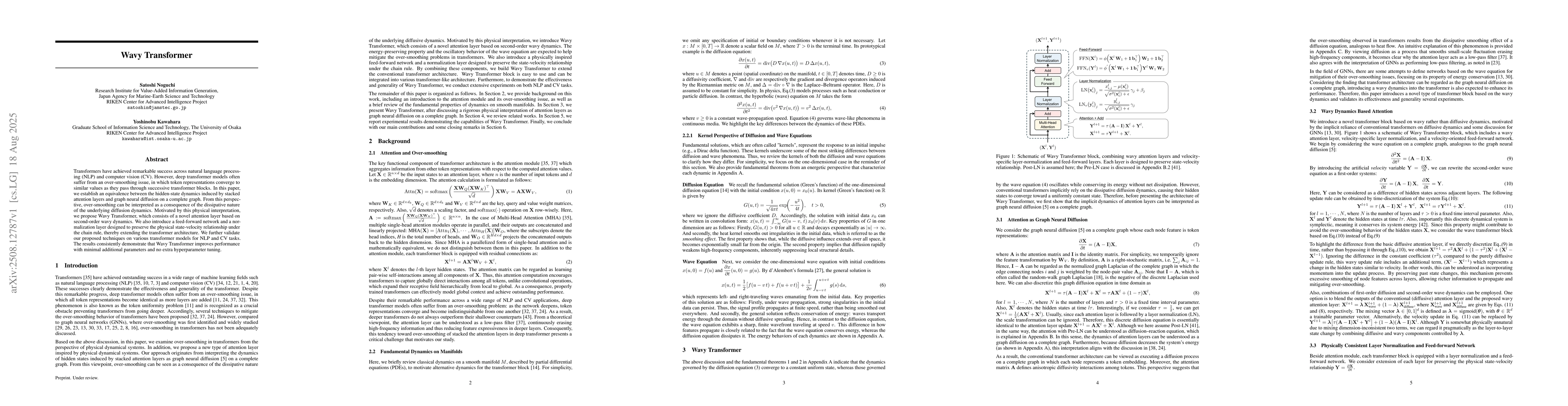 Transformers have achieved remarkable success across natural language processing (NLP) and computer vision (CV). However, deep transformer models often suffer from an over-smoothing issue, in which token representations converge to similar values as they pass through successive transformer blocks. In this paper, we establish an equivalence between the hidden-state dynamics induced by stacked attention layers and graph neural diffusion on a complete graph. From this perspective, over-smoothing can be interpreted as a consequence of the dissipative nature of the underlying diffusion dynamics. Motivated by this physical interpretation, we propose Wavy Transformer, which consists of a novel attention layer based on second-order wavy dynamics. We also introduce a feed-forward network and a normalization layer designed to preserve the physical state-velocity relationship under the chain rule, thereby extending the transformer architecture. We further validate our proposed techniques on various transformer models for NLP and CV tasks. The results consistently demonstrate that Wavy Transformer improves performance with minimal additional parameters and no extra hyperparameter tuning.